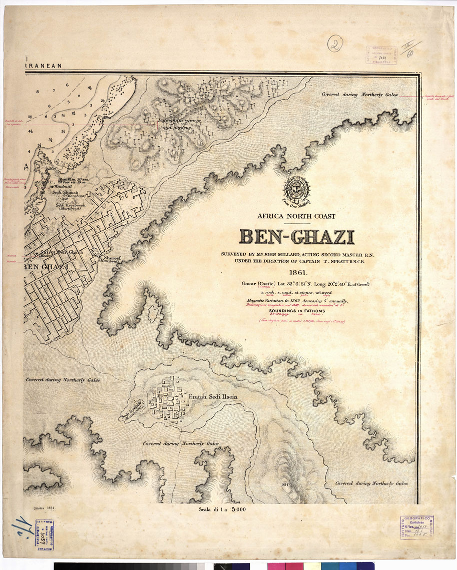 "Carta in 4 fogli stampati in nero con aggiunte a mano (traduzione). In basso nei fogli n. 3 e 4 vi è la veduta della città di Ben Ghazi. I fogli n. 3 e 4 sono stati ristampati nel 1978. Ammiragliato Inglese, Londra."