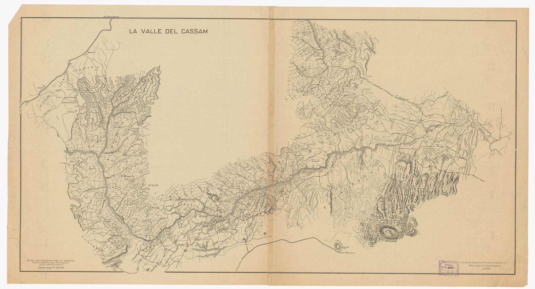 "La rappresentazione orografica è dimostrativa. Rilievo aerofotogrammetrico speditivo toponomastica da informazioni. Comando Superiore Forze Armate dell'A.O.I., Ufficio Superiore Topocartografico (I.G.M.)."