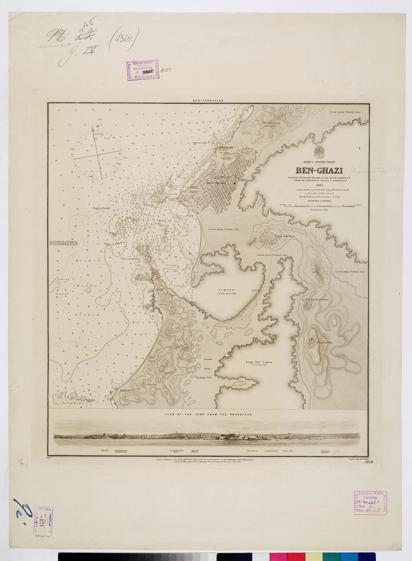 "In basso la veduta della città di Bengasi. Carta dell'Ammiragliato Inglese, Londra. J. & C. Walker engraved."