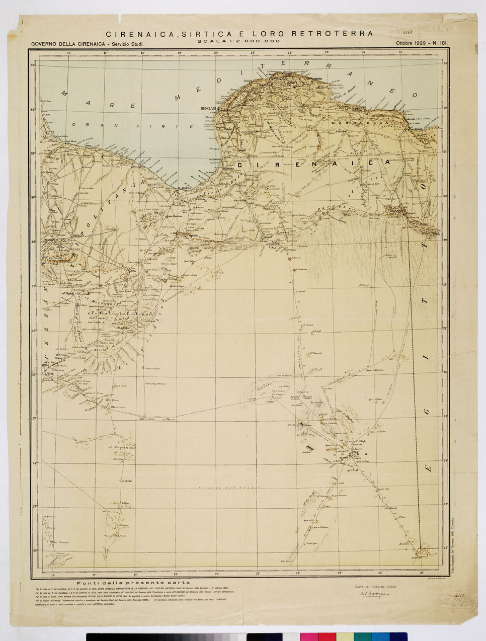 "Governo della Cirenaica. Ufficio Studi. Un foglio in tipolitografia. Rappresenta il terreno a fondo unito giallino con forme orografiche accennate in bistro. Indica abitati, pozzi, strade, itinerari, confini. La prima edizione(1929) venne disegnata da G. Ferrero e R. Bonati la seconda (1932) da G. Ferrero. Compilazione del Col. De Agostini. A sinistra in basso è data indicazione delle fonti cartografiche impiegate."