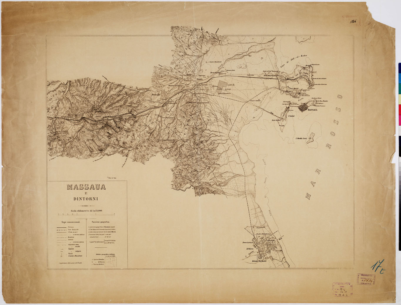 "I.G.M. La carta è in tre fogli riprodotti in fotozincografia sui rilievi eseguiti nel 1888 completati con quelli del 1885 (Ten.i Lavallea, De Fonseca, top. Ciorlieri) e appoggiati ad una triangolazione grafica. La posizione di Massaua (spigolo sud-est del Palazzo del Comando) fu determinata in base agli elementi forniti dalla R. Marina (Cannoniera "Scilla") dai quali risulta a 15° 36' 41" lat. nord, ed a 39° 28' 9" longitudine est Greenwich. La rappresentazione orografica è a curve di livello tracciate all'equidistanza di 5 m. I fogli comprendono la zona adiacente alla ferrovia Massaua Saati e il litorale fino al villaggio di Arkico. La carta è stampata in nero: fu riprodotta a colori e inserita nella "Rivista Militare Italiana" (settembre 1888) ad accompagnare la relazione ufficiale della campagna di guerra per la rioccupazione di Saati (1887-1888) in occasione della quale furono compiute le ulteriori operazioni topografiche in quella zona. Questi rilievi e quelli al 10.000 intorno a Massaua eseguiti nel 1885-1888 dal Tenente Lavallea (ved. N° 4 e 19 d'ordine, N. 4258 e 1834 d'inventario generale), furono poi impiegati nella preparazione della carta al 50.000 della Colonia Eritrea (ved. N° 61 d'ordine, N. 724 d' inventario generale)."