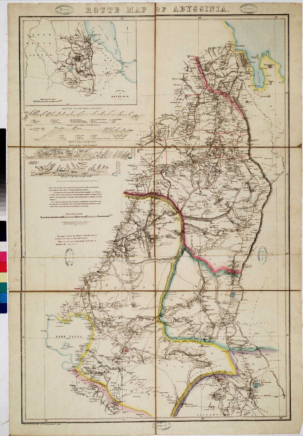 "Un foglio montato su tela a stacchi. Rappresentazione orografica dimostrativa. In alto a sinistra un riquadro con la carta generale dell'Abissinia e alcune sezioni di territorio. Carta compilata da E. G. Ravenstein, F.R.G.S. Topographical Depot."