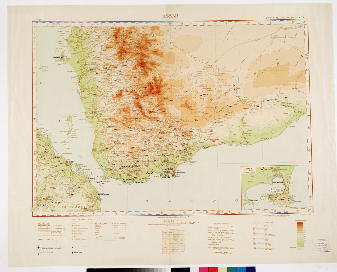 "Le dimensioni del presente foglio non consentono l'attacco con i fogli contigui delle edizioni fino al 1939. La rappresentazione orografica è a tinte ipsometriche. In basso sono presenti: i segni convenzionali, la scala delle tinte ipsometriche e un quadro d'unione alla scala di 1:50.000.000. Nel riquadro in basso a destra: Aden alla scala di 1:150.000. Comando Superiore delle Forze Armate dell'Impero, Stato Maggiore Ufficio Topocartografico."