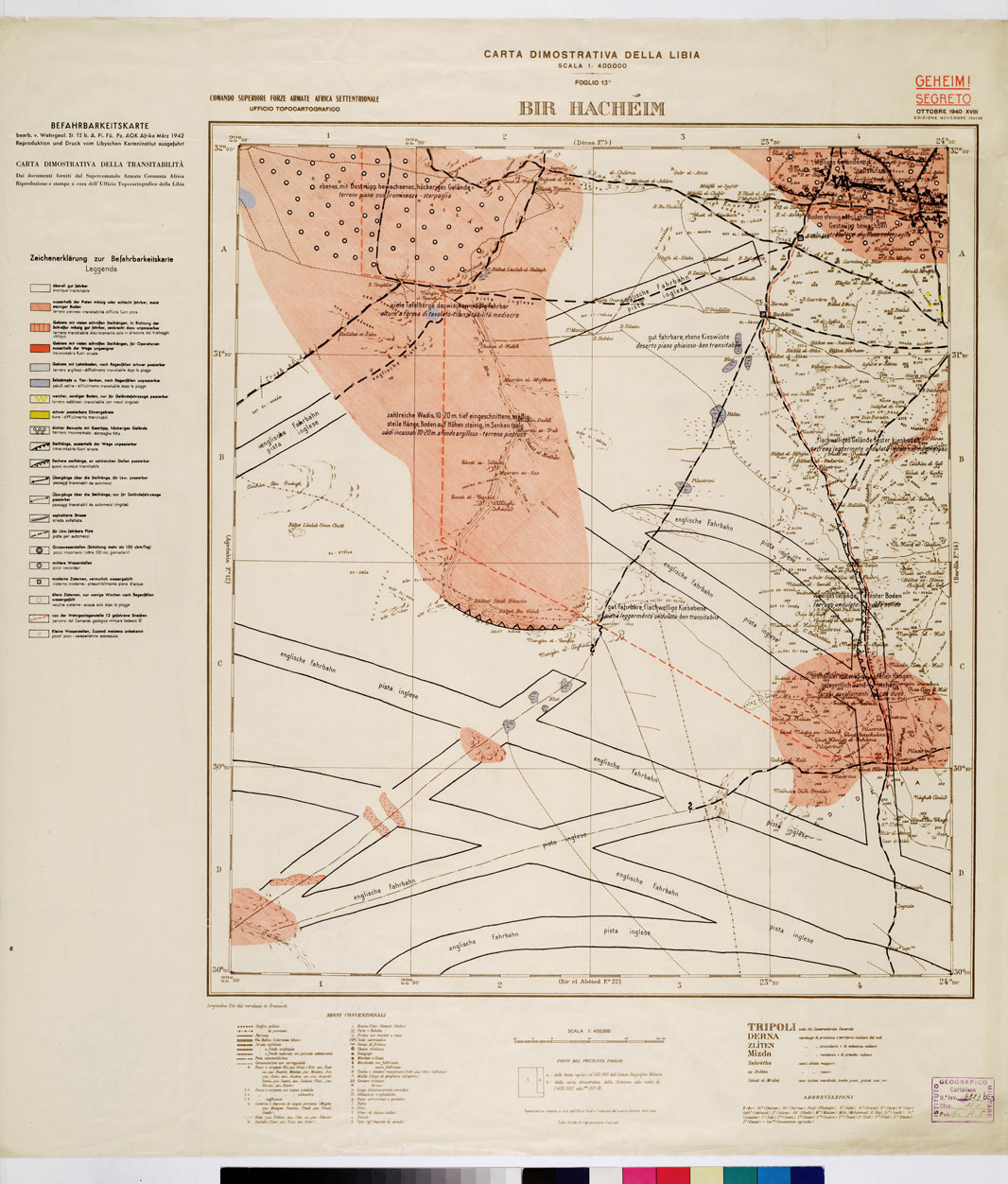 "Carta dimostrativa della transitabilità, dai documenti forniti dal Supercomando Armata Corazzata Africa. La toponomastica è riveduta a cura dell'Ufficio Studi e Traduzioni del Governo Generale della Libia. Rappresentazione orografica dimostrativa. In basso vi sono i segni convenzionali. Sul lato sinistro della carta vi è la leggenda dei colori che indicano la transitabilità delle strade. Comando Superiore Forze Armate Africa Settentrionale, Ufficio Topocartografico."