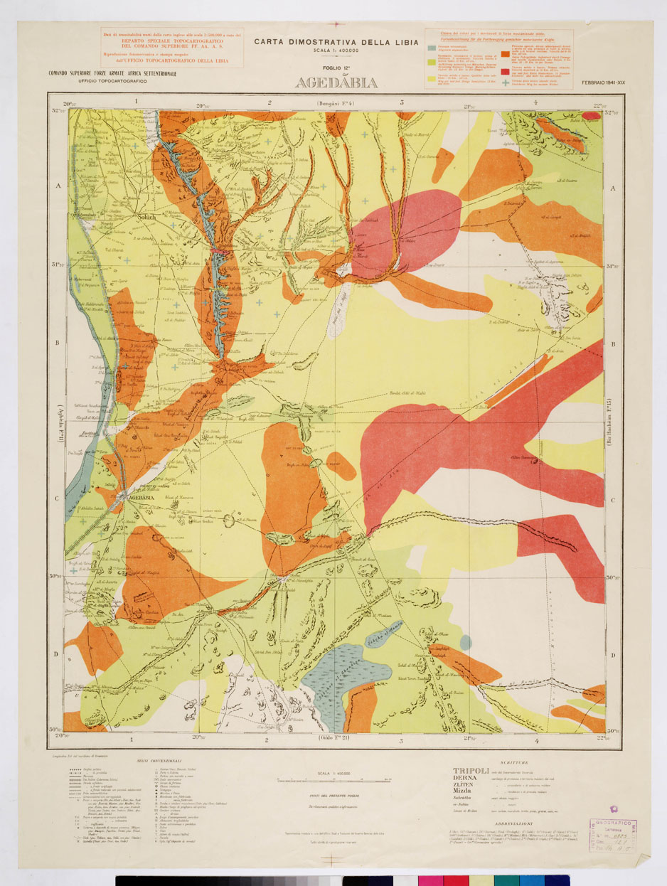 "Dati di transitabilità tratti dalla carta inglese alla scala 1:500.000 a cura del Reparto Speciale Topocartografico del Comando Superiore FF. AA. A. S. La toponomastica è riveduta a cura dell'Ufficio Studi e Traduzioni del Governo Generale della Libia. Rappresentazione orografica dimostrativa. In basso vi sono i segni convenzionali. In alto a destra la chiave dei colori per i movimenti di forze meccanizzate miste. Comando Superiore Forze Armate Africa Settentrionale, Ufficio Topocartografico."