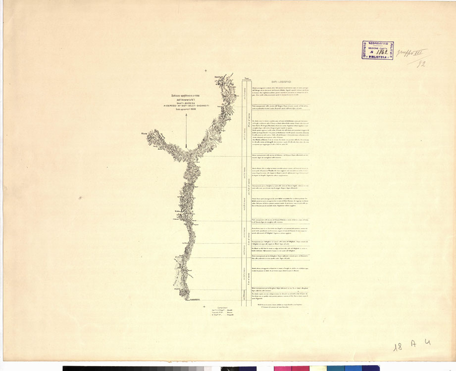 "I.G.M. Sono ventisei schizzi su fogli rilegati e contenuti in volume, eseguiti dai Cap.i Ravelli, Manfren e Gastaldi, dai ten. Piccioli e Guastone e dai topografi Borzini e Grupelli. Essi comprendano i seguenti tratti: 1) Saati-Baresa-Aidereso-Af Siot-Selet-Saganeiti 2) Aidereso-Belek-Caiacor-Adi Dek Amharè-Gura-Saganeiti 3) Asmara-Nefasit-Ghinda 4) Asmara-Az Nefas-Ghinda 5) Af Siot Belek-Nefasit-Aidereso 6) Archico-Ua à-Kumailè-Zula 7) Ua à Illalia-mahio-Adi Cajèh 8) Senafè-Sonactè-Komailè 9) Sganeiti-Acrur-Illalia-Schillichi 10) Adi cajèh-Mai Serau-Halai-Mahio 11) Saganeiti-Halai-Adi Cajeh-Senafè 12) Saganeiti-Mai serau-Coatit 13) Gura-Mai Haini 14) Asmara-Adi Dek Amharè-Saganeiti 15) Adi Ugri-Mai Haini-Coatit-Adi Cajèh 16) Adi Ugri-Mai Haini 17) Adi Qualà-Ad Tafà-Mai Haini 18) Adi Ugri-Adi Qualà-Mareb-Confluenza Unguia 19) Confluenza Unguia-Ad Tafà-Adi Ugri 20) Asmara-Scichet-Adi Ugri 21) Asmara-Himberti-Mai Tatè 22) Mai Tatè-Agordat 23) Agordat-Mogolo-Acque di Leida 24) Acque di Leida Mai Dahro 25) Mai Dahro Mai Matellis 26) Mai Mafellis-Arresa-Adi Ugri. Il disegno delle strade è in rosso le acque sono colorate in bleu l'orografia in bistro dimostrata col tratteggio. Ogni itinerario è accompagnato dalla leggenda dei dati logistici. Le distanze sono calcolate in ore di marcia. L'atlante che raccoglie gli itinerari è corredato di uno schizzo logistico della Colonia Eritrea alla scala di 1:250.000 compilato dal Cap. Ravelli e da un quadro d'unione alla scala di 1:500.000 con indici. La stessa carta è al n. d'inventario 780."