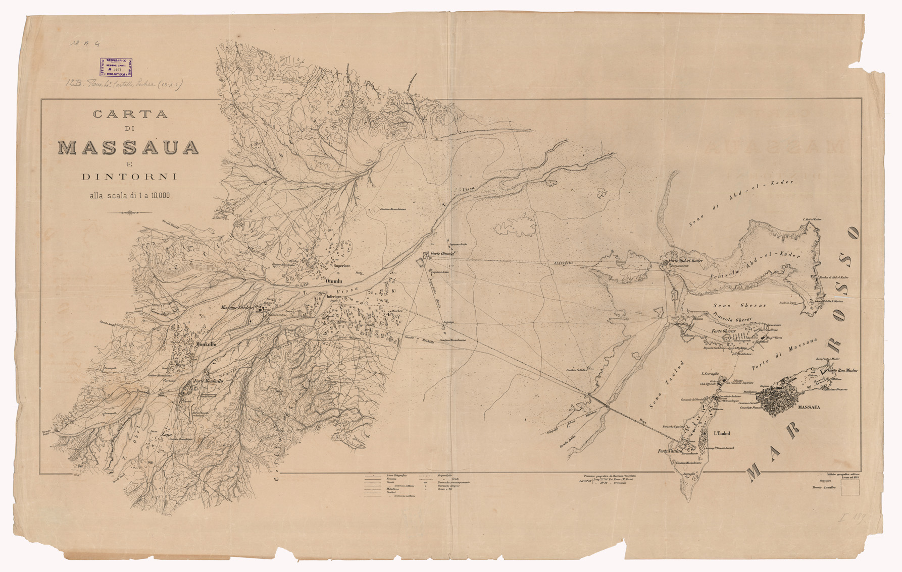 "I.G.M. Riduzione dei rilievi eseguiti nel 1885 affidati dall'I.G.M. al Ten. Lavallea immediatamente dopo l'occupazione militare della città. La zona rilevata comprende l'isoletta di Massaua, Taulud e il terreno adiacente fin poco oltre Monkullo. I rilievi non si appoggiano a punti trigonometrici. Le forme del terreno sono rappresentate con curve tracciate all'equidistanza di 5 m frequenti le quote altimetriche. Il foglio è stampato in nero. Esso fu poi ridotto con la fotozincografia alla scala di 1:20.000 (ved. N° 19 d'ordine, N. 1834 d' inventario) e stampato a colori. Questi rilievi e quelli di Assab e dintorni (ved. N° 5 d'ordine, N. 808 d'inventario) alla stessa scala, eseguiti dallo stesso ufficiale nello stesso anno, furono l'inizio dei lavori topografici dell'I.G.M. nella Colonia Eritrea."