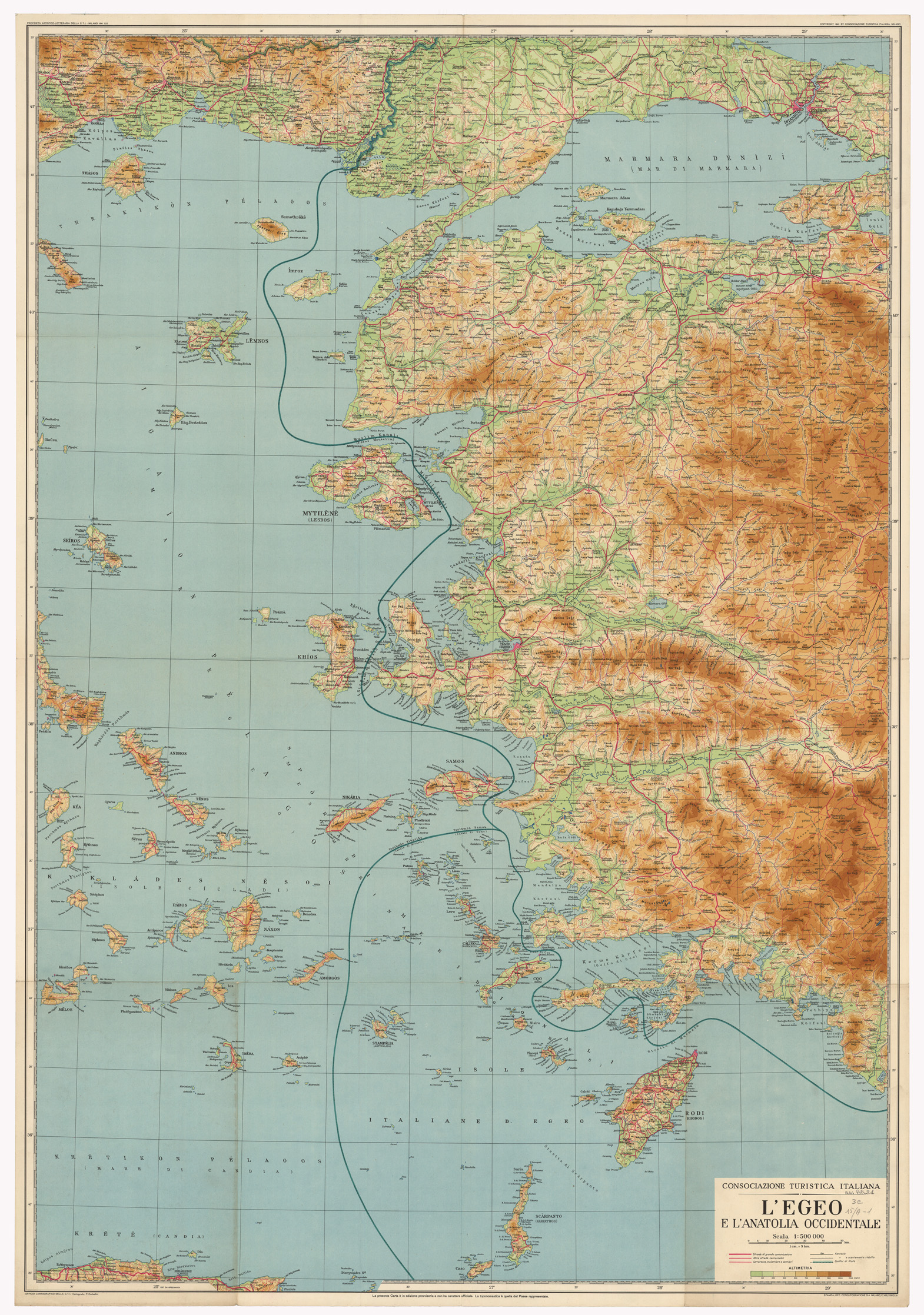 "La carta è a tinte ipsometriche. Nella parte inferiore della carta ci sono la leggenda dei segni e la scala altimetrica. Ufficio Cartografico della C.T.I. Cartografo Corbellini. Proprietà artistico letteraria della C.T.I. Milano."