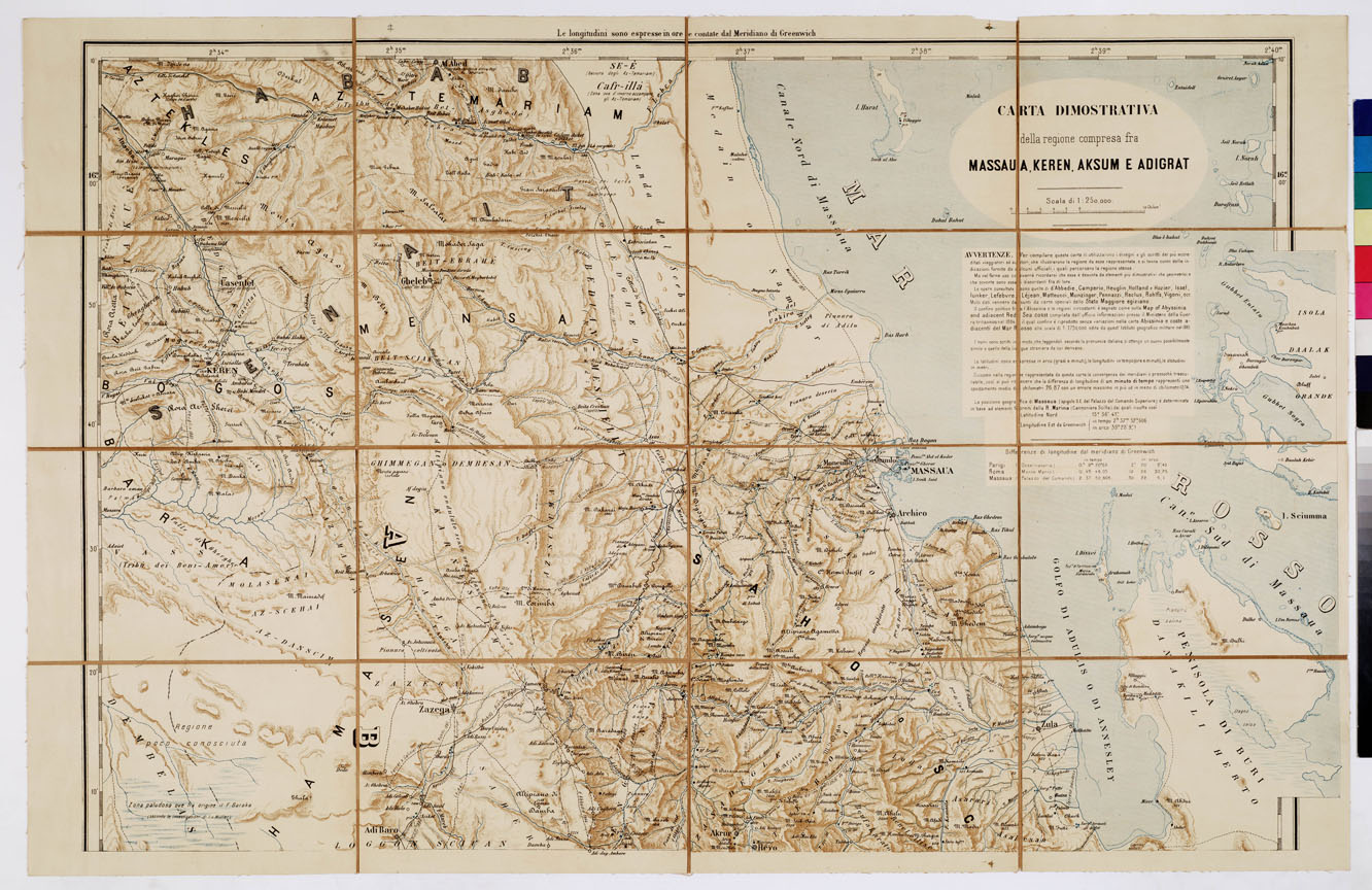 "I.G.M. La carta fu pubblicata in previsione degli avvenimenti politico-militari nelle regioni limitrofe ai possedimenti di Massaua. Essa comprende, oltre i dintorni immediati di Massaua, tutto il paese occupato dai Mensa, Habab e Bogos fino a Cheren, il Tigré settentrionale con Adua e Acsun, e la penisola di Buri. La compilazione fu basata sulle relazioni, gli scritti e i disegni dei più accreditati geografi e dei viaggiatori che visitarono e illustrarono la regione, oltre le informazioni di ufficiali che percorsero quella zona. Furono consultati i lavori del D'Abbadie, Münzinger, Lejean, Heuglin, Réclus, Petermann e fra gli italiani, del Sapeto, Issel, Matteucci, Vigoni, Bianchi, Nerazzini, Colaci. Per i dintorni immediati di Massaua servirono i rilievi eseguiti nel 1885 dal Ten. Lavallea. Furono pure impiegati i rilievi idrografici fatti dalla R. Cannoniera Scilla nel 1886, ed i dati delle carte dello Stato Maggiore Egiziano. I confini tra l'Abissinia e le regioni circostanti furono desunti dalla "Map of Abyssinia and adjacent Red See coast" compilata dall'Ufficio Informazioni presso il Ministero della Guerra britannico nel 1884 e riprodotti anche nella Carta dell'Abissinia e coste adiacenti del Mar Rosso alla scala di 1:1.750.000 edita dell'I.G.M. nel 1885. La carta riassume cosi tutte le conoscenze che della nostra colonia si avevano all'epoca della pubblicazione. I nomi sono scritti in grafia italiana. Per la posizione geografica di Massaua servirono le determinazioni della R. Nave "Scilla" risultando essere 15° 36' 41" lat. nord e 29° 28' 9" long. est Greenwich. Le latitudini sono espresse in arco (gradi e minuti) le longitudini in tempo (ore e minuti) le altitudini in metri. Frequenti le quote altimetriche. La carta è riprodotta in cromolitografia a colori nero per la planimetria (strade, itinerari, confini, centri abitati) e le scritture, bistro per l'orografia (tratteggio), azzurro per le acque. La carta originale alla scala di 1:250.000 è in quattro fogli (cm. 36 x 48). Venne fatta poi una riduzione al 400.000 in un foglio solo (cm. 46 x 61). Una copia della carta è montata su tela, e custodita in busta."