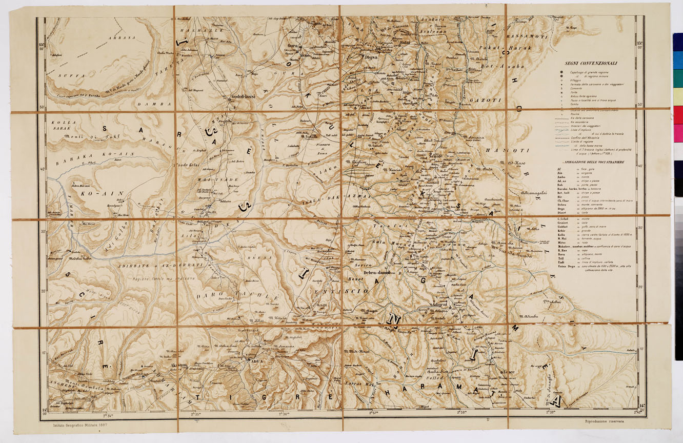 "I.G.M. La carta fu pubblicata in previsione degli avvenimenti politico-militari nelle regioni limitrofe ai possedimenti di Massaua. Essa comprende, oltre i dintorni immediati di Massaua, tutto il paese occupato dai Mensa, Habab e Bogos fino a Cheren, il Tigré settentrionale con Adua e Acsun, e la penisola di Buri. La compilazione fu basata sulle relazioni, gli scritti e i disegni dei più accreditati geografi e dei viaggiatori che visitarono e illustrarono la regione, oltre le informazioni di ufficiali che percorsero quella zona. Furono consultati i lavori del D'Abbadie, Münzinger, Lejean, Heuglin, Réclus, Petermann e fra gli italiani, del Sapeto, Issel, Matteucci, Vigoni, Bianchi, Nerazzini, Colaci. Per i dintorni immediati di Massaua servirono i rilievi eseguiti nel 1885 dal Ten. Lavallea. Furono pure impiegati i rilievi idrografici fatti dalla R. Cannoniera Scilla nel 1886, ed i dati delle carte dello Stato Maggiore Egiziano. I confini tra l'Abissinia e le regioni circostanti furono desunti dalla "Map of Abyssinia and adjacent Red See coast" compilata dall'Ufficio Informazioni presso il Ministero della Guerra britannico nel 1884 e riprodotti anche nella Carta dell'Abissinia e coste adiacenti del Mar Rosso alla scala di 1:1.750.000 edita dell'I.G.M. nel 1885. La carta riassume cosi tutte le conoscenze che della nostra colonia si avevano all'epoca della pubblicazione. I nomi sono scritti in grafia italiana. Per la posizione geografica di Massaua servirono le determinazioni della R. Nave "Scilla" risultando essere 15° 36' 41" lat. nord e 29° 28' 9" long. est Greenwich. Le latitudini sono espresse in arco (gradi e minuti) le longitudini in tempo (ore e minuti) le altitudini in metri. Frequenti le quote altimetriche. La carta è riprodotta in cromolitografia a colori nero per la planimetria (strade, itinerari, confini, centri abitati) e le scritture, bistro per l'orografia (tratteggio), azzurro per le acque. La carta originale alla scala di 1:250.000 è in quattro fogli (cm. 36 x 48). Venne fatta poi una riduzione al 400.000 in un foglio solo (cm. 46 x 61). Una copia della carta è montata su tela, e custodita in busta."