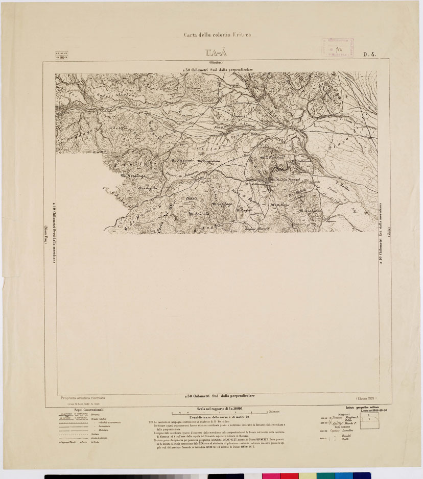 "I.G.M. Riproduzione fotozincografica delle levate originali eseguite alla medesima scala tra gli anni 1885 e 1891. Questa carta comprende la parte centrale della Colonia tra Zula, Emberèmi, Giangheren e Himberti. La proiezione adottata fu quella del Cassini con centro di sviluppo la Cupola del Palazzo del Comando a Massaua la cui posizione geografica era stata determinata astronomicamente fin dal 1885 dalla R. Marina. La carta è in 26 fogli di m. 0,40 di lato, corrispondente quindi a 20 Km. sul terreno. La pubblicazione fu iniziata nel 1890 in edizione policroma (nero per la nomenclatura, le strade, le dune di sabbia azzurro per l'idrografia bistro per il terreno rosso per le quote trigonometriche) per i primi fogli e fu poi continuata in nero. In seguito la carta fu stampata interamente in nero. Nel 1909 fu allestita una nuova edizione in nero a curve di livello con equidistanza di 50 m. e numerose quote trigonometriche e topografiche. Fa eccezione il foglio Sciotel (rilevato dal Cap. Severi nel 1894) senza curve, con orografia a tratteggio. Nell'ultima edizione figurano in ciascun foglio i nomi dei mappatori e le date delle levate."