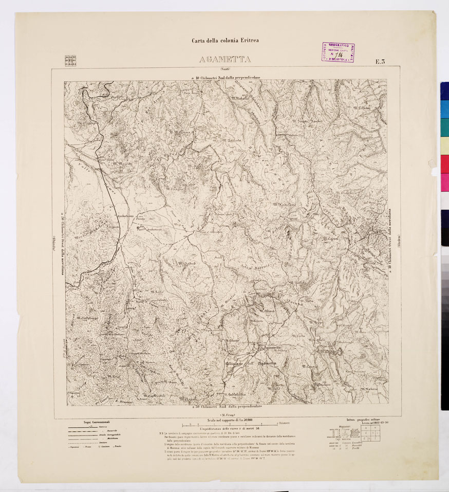 "I.G.M. Riproduzione fotozincografica delle levate originali eseguite alla medesima scala tra gli anni 1885 e 1891. Questa carta comprende la parte centrale della Colonia tra Zula, Emberèmi, Giangheren e Himberti. La proiezione adottata fu quella del Cassini con centro di sviluppo la Cupola del Palazzo del Comando a Massaua la cui posizione geografica era stata determinata astronomicamente fin dal 1885 dalla R. Marina. La carta è in 26 fogli di m. 0,40 di lato, corrispondente quindi a 20 Km. sul terreno. La pubblicazione fu iniziata nel 1890 in edizione policroma (nero per la nomenclatura, le strade, le dune di sabbia azzurro per l'idrografia bistro per il terreno rosso per le quote trigonometriche) per i primi fogli e fu poi continuata in nero. In seguito la carta fu stampata interamente in nero. Nel 1909 fu allestita una nuova edizione in nero a curve di livello con equidistanza di 50 m. e numerose quote trigonometriche e topografiche. Fa eccezione il foglio Sciotel (rilevato dal Cap. Severi nel 1894) senza curve, con orografia a tratteggio. Nell'ultima edizione figurano in ciascun foglio i nomi dei mappatori e le date delle levate."