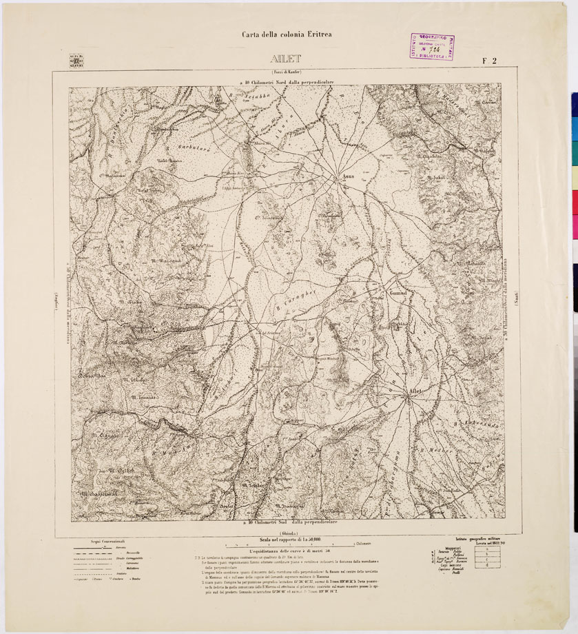 "I.G.M. Riproduzione fotozincografica delle levate originali eseguite alla medesima scala tra gli anni 1885 e 1891. Questa carta comprende la parte centrale della Colonia tra Zula, Emberèmi, Giangheren e Himberti. La proieziione adottata fu quella del Cassini con centro di sviluppo la Cupola del Palazzo del Comando a Massaua la cui posizione geografica era stata determinata astronomicamente fin dal 1885 dalla R. Marina. La carta è in 26 fogli di m. 0,40 di lato, corrispondente quindi a 20 Km. sul terreno. La pubblicazione fu iniziata nel 1890 in edizione policroma (nero per la nomenclatura, le strade, le dune di sabbia azzurro per l'idrografia bistro per il terreno rosso per le quote trigonometriche) per i primi fogli e fu poi continuata in nero. In seguito la carta fu stampata interamente in nero. Nel 1909 fu allestita una nuova edizione in nero a curve di livello con equidistanza di 50 m. e numerose quote trigonometriche e topografiche. Fa eccezione il foglio Sciotel (rilevato dal Cap. Severi nel 1894) senza curve, con orografia a tratteggio. Nell'ultima edizione figurano in ciascun foglio i nomi dei mappatori e le date delle levate."