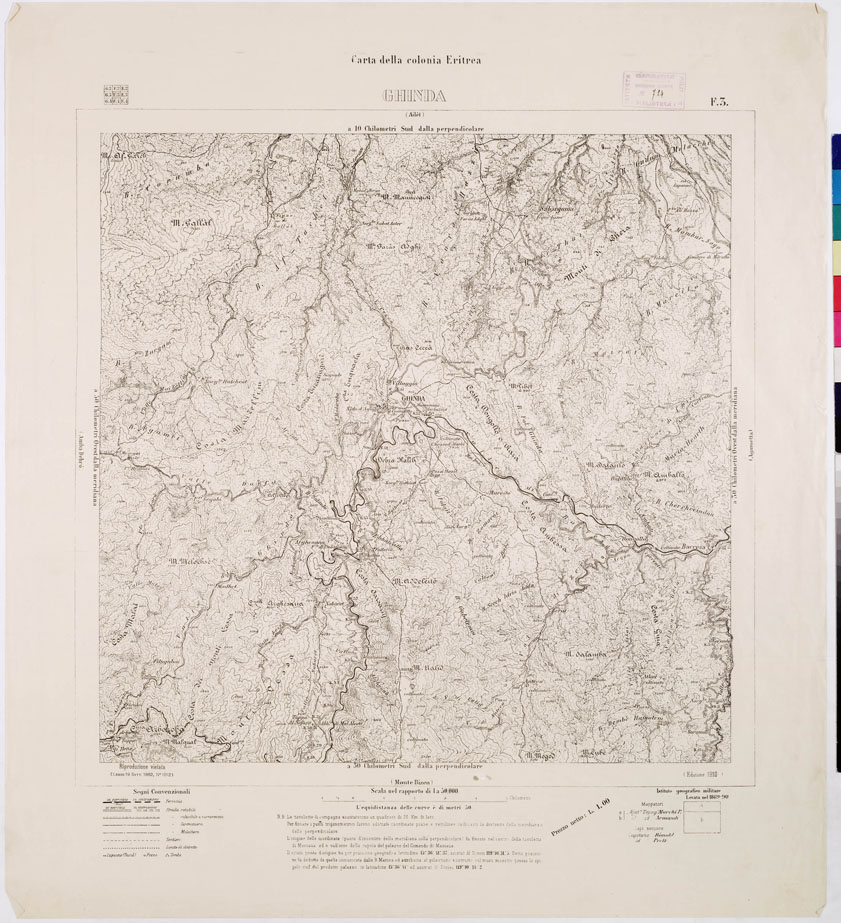 "I.G.M. Riproduzione fotozincografica delle levate originali eseguite alla medesima scala tra gli anni 1885 e 1891. Questa carta comprende la parte centrale della Colonia tra Zula, Emberèmi, Giangheren e Himberti. La proiezione adottata fu quella del Cassini con centro di sviluppo la Cupola del Palazzo del Comando a Massaua la cui posizione geografica era stata determinata astronomicamente fin dal 1885 dalla R. Marina. La carta è in 26 fogli di m. 0,40 di lato, corrispondente quindi a 20 Km. sul terreno. La pubblicazione fu iniziata nel 1890 in edizione policroma (nero per la nomenclatura, le strade, le dune di sabbia azzurro per l'idrografia bistro per il terreno rosso per le quote trigonometriche) per i primi fogli e fu poi continuata in nero. In seguito la carta fu stampata interamente in nero. Nel 1909 fu allestita una nuova edizione in nero a curve di livello con equidistanza di 50 m. e numerose quote trigonometriche e topografiche. Fa eccezione il foglio Sciotel (rilevato dal Cap. Severi nel 1894) senza curve, con orografia a tratteggio. Nell'ultima edizione figurano in ciascun foglio i nomi dei mappatori e le date delle levate."