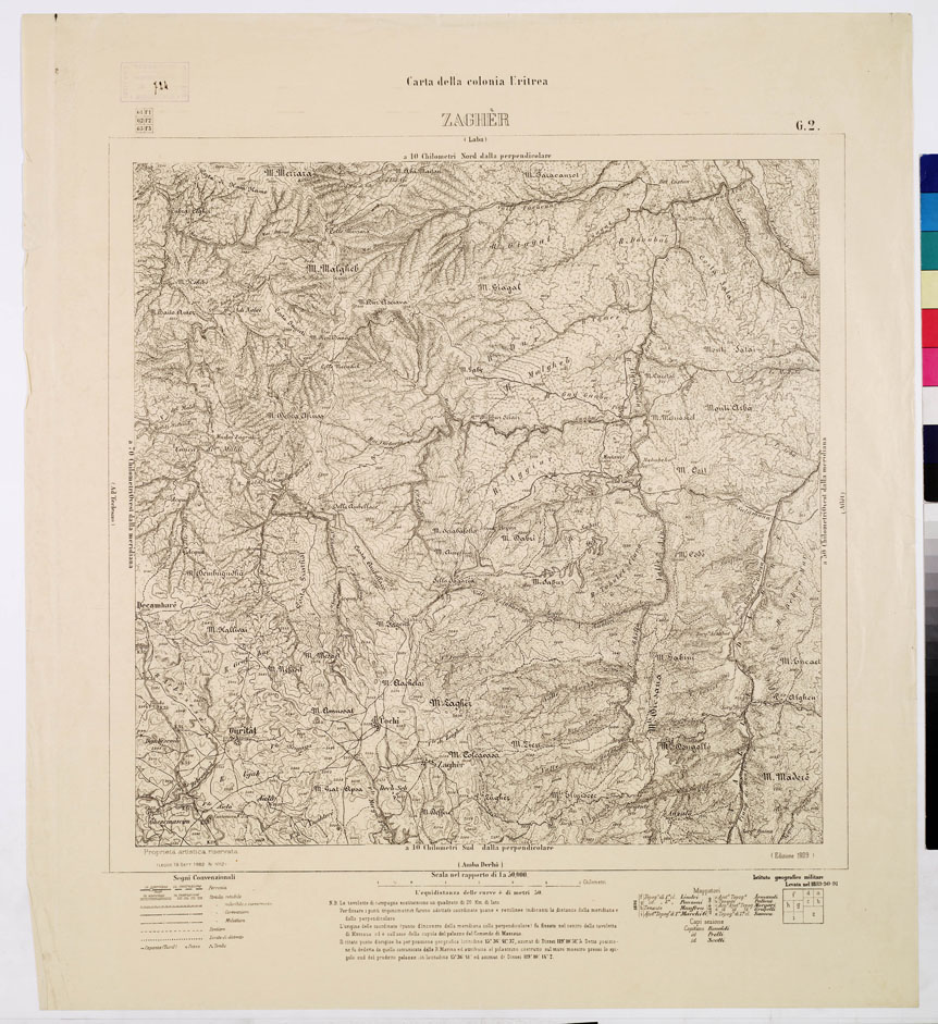 "I.G.M. Riproduzione fotozincografica delle levate originali eseguite alla medesima scala tra gli anni 1885 e 1891. Questa carta comprende la parte centrale della Colonia tra Zula, Emberèmi, Giangheren e Himberti. La proiezione adottata fu quella del Cassini con centro di sviluppo la Cupola del Palazzo del Comando a Massaua la cui posizione geografica era stata determinata astronomicamente fin dal 1885 dalla R. Marina. La carta è in 26 fogli di m. 0,40 di lato, corrispondente quindi a 20 Km. sul terreno. La pubblicazione fu iniziata nel 1890 in edizione policroma (nero per la nomenclatura, le strade, le dune di sabbia azzurro per l'idrografia bistro per il terreno rosso per le quote trigonometriche) per i primi fogli e fu poi continuata in nero. In seguito la carta fu stampata interamente in nero. Nel 1909 fu allestita una nuova edizione in nero a curve di livello con equidistanza di 50 m. e numerose quote trigonometriche e topografiche. Fa eccezione il foglio Sciotel (rilevato dal Cap. Severi nel 1894) senza curve, con orografia a tratteggio. Nell'ultima edizione figurano in ciascun foglio i nomi dei mappatori e le date delle levate."