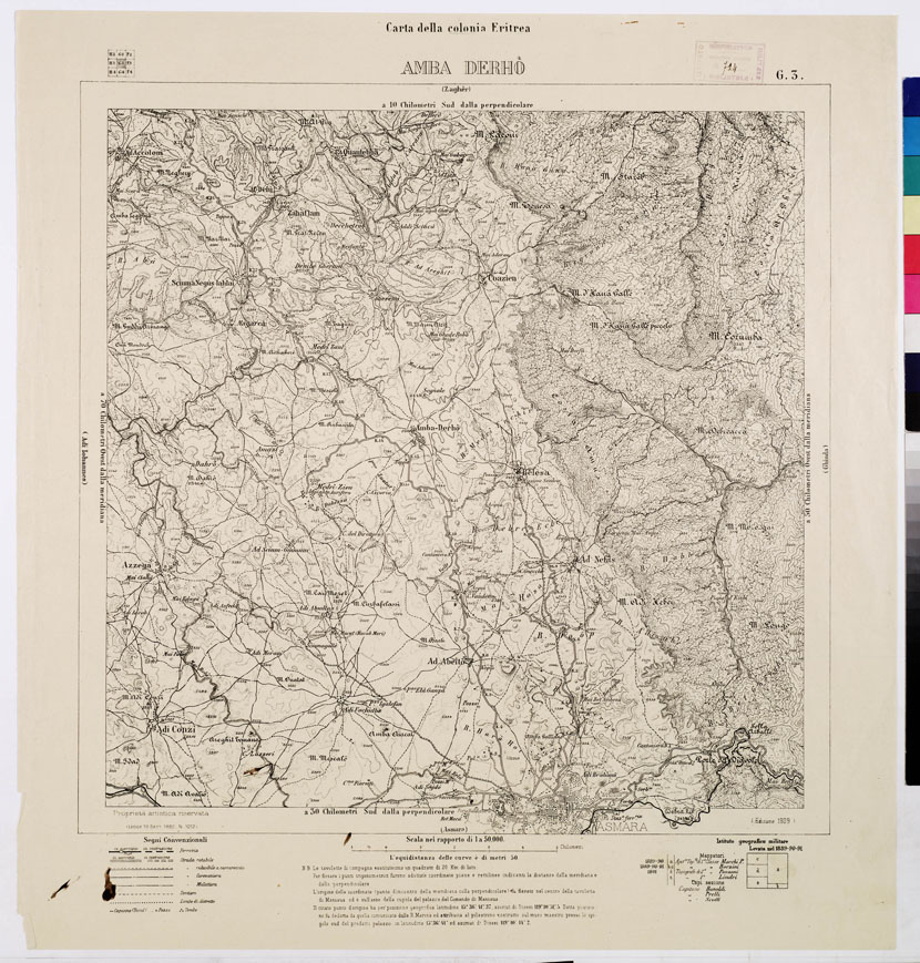 "I.G.M. Riproduzione fotozincografica delle levate originali eseguite alla medesima scala tra gli anni 1885 e 1891. Questa carta comprende la parte centrale della Colonia tra Zula, Emberèmi, Giangheren e Himberti. La proiezione adottata fu quella del Cassini con centro di sviluppo la Cupola del Palazzo del Comando a Massaua la cui posizione geografica era stata determinata astronomicamente fin dal 1885 dalla R. Marina. La carta è in 26 fogli di m. 0,40 di lato, corrispondente quindi a 20 Km. sul terreno. La pubblicazione fu iniziata nel 1890 in edizione policroma (nero per la nomenclatura, le strade, le dune di sabbia azzurro per l'idrografia bistro per il terreno rosso per le quote trigonometriche) per i primi fogli e fu poi continuata in nero. In seguito la carta fu stampata interamente in nero. Nel 1909 fu allestita una nuova edizione in nero a curve di livello con equidistanza di 50 m. e numerose quote trigonometriche e topografiche. Fa eccezione il foglio Sciotel (rilevato dal Cap. Severi nel 1894) senza curve, con orografia a tratteggio. Nell'ultima edizione figurano in ciascun foglio i nomi dei mappatori e le date delle levate."
