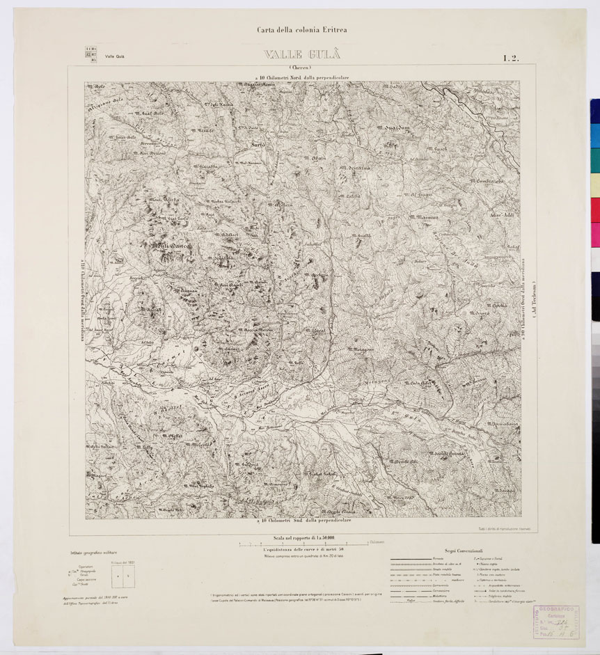 "I.G.M. Riproduzione fotozincografica delle levate originali eseguite alla medesima scala tra gli anni 1885 e 1891. Questa carta comprende la parte centrale della Colonia tra Zula, Emberèmi, Giangheren e Himberti. La proiezione adottata fu quella del Cassini con centro di sviluppo la Cupola del Palazzo del Comando a Massaua la cui posizione geografica era stata determinata astronomicamente fin dal 1885 dalla R. Marina. La carta è in 26 fogli di m. 0,40 di lato, corrispondente quindi a 20 Km. sul terreno. La pubblicazione fu iniziata nel 1890 in edizione policroma (nero per la nomenclatura, le strade, le dune di sabbia azzurro per l'idrografia bistro per il terreno rosso per le quote trigonometriche) per i primi fogli e fu poi continuata in nero. In seguito la carta fu stampata interamente in nero. Nel 1909 fu allestita una nuova edizione in nero a curve di livello con equidistanza di 50 m. e numerose quote trigonometriche e topografiche. Fa eccezione il foglio Sciotel (rilevato dal Cap. Severi nel 1894) senza curve, con orografia a tratteggio. Nell'ultima edizione figurano in ciascun foglio i nomi dei mappatori e le date delle levate."