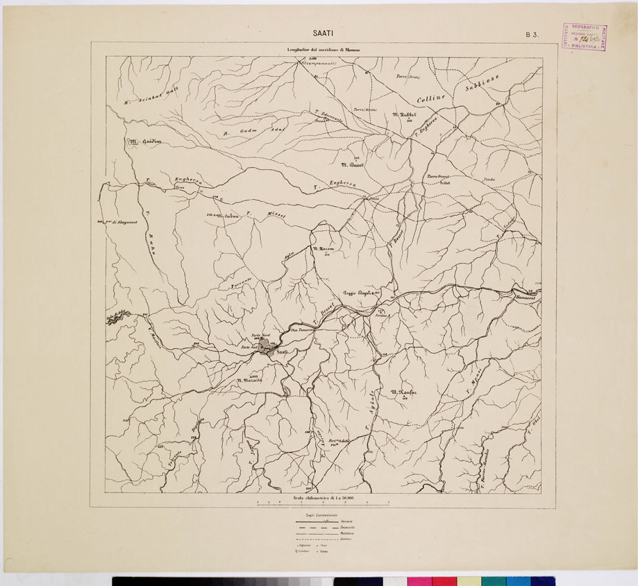 "I.G.M. Riproduzione fotozincografica delle levate originali eseguite alla medesima scala tra gli anni 1885 e 1891. Questa carta comprende la parte centrale della Colonia tra Zula, Emberèmi, Giangheren e Himberti. La proiezione adottata fu quella del Cassini con centro di sviluppo la Cupola del Palazzo del Comando a Massaua la cui posizione geografica era stata determinata astronomicamente fin dal 1885 dalla R. Marina. La carta è in 26 fogli di m. 0,40 di lato, corrispondente quindi a 20 Km. sul terreno. La pubblicazione fu iniziata nel 1890 in edizione policroma (nero per la nomenclatura, le strade, le dune di sabbia azzurro per l'idrografia bistro per il terreno rosso per le quote trigonometriche) per i primi fogli e fu poi continuata in nero. In seguito la carta fu stampata interamente in nero. Nel 1909 fu allestita una nuova edizione in nero a curve di livello con equidistanza di 50 m. e numerose quote trigonometriche e topografiche. Fa eccezione il foglio Sciotel (rilevato dal Cap. Severi nel 1894) senza curve, con orografia a tratteggio. Nell'ultima edizione figurano in ciascun foglio i nomi dei mappatori e le date delle levate."