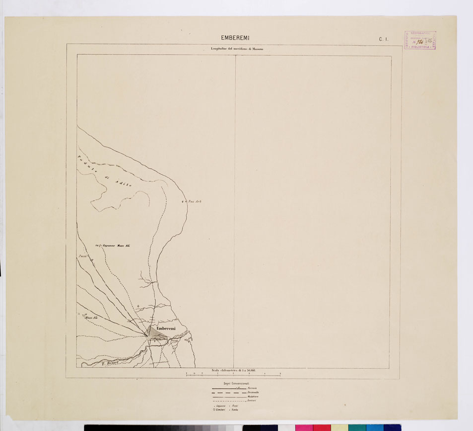 "I.G.M. Riproduzione fotozincografica delle levate originali eseguite alla medesima scala tra gli anni 1885 e 1891. Questa carta comprende la parte centrale della Colonia tra Zula, Emberèmi, Giangheren e Himberti. La proiezione adottata fu quella del Cassini con centro di sviluppo la Cupola del Palazzo del Comando a Massaua la cui posizione geografica era stata determinata astronomicamente fin dal 1885 dalla R. Marina. La carta è in 26 fogli di m. 0,40 di lato, corrispondente quindi a 20 Km. sul terreno. La pubblicazione fu iniziata nel 1890 in edizione policroma (nero per la nomenclatura, le strade, le dune di sabbia azzurro per l'idrografia bistro per il terreno rosso per le quote trigonometriche) per i primi fogli e fu poi continuata in nero. In seguito la carta fu stampata interamente in nero. Nel 1909 fu allestita una nuova edizione in nero a curve di livello con equidistanza di 50 m.e numerose quote trigonometriche e topografiche. Fa eccezione il foglio Sciotel (rilevato dal Cap. Severi nel 1894) senza curve, con orografia a tratteggio. Nell'ultima edizione figurano in ciascun foglio i nomi dei mappatori e le date delle levate."
