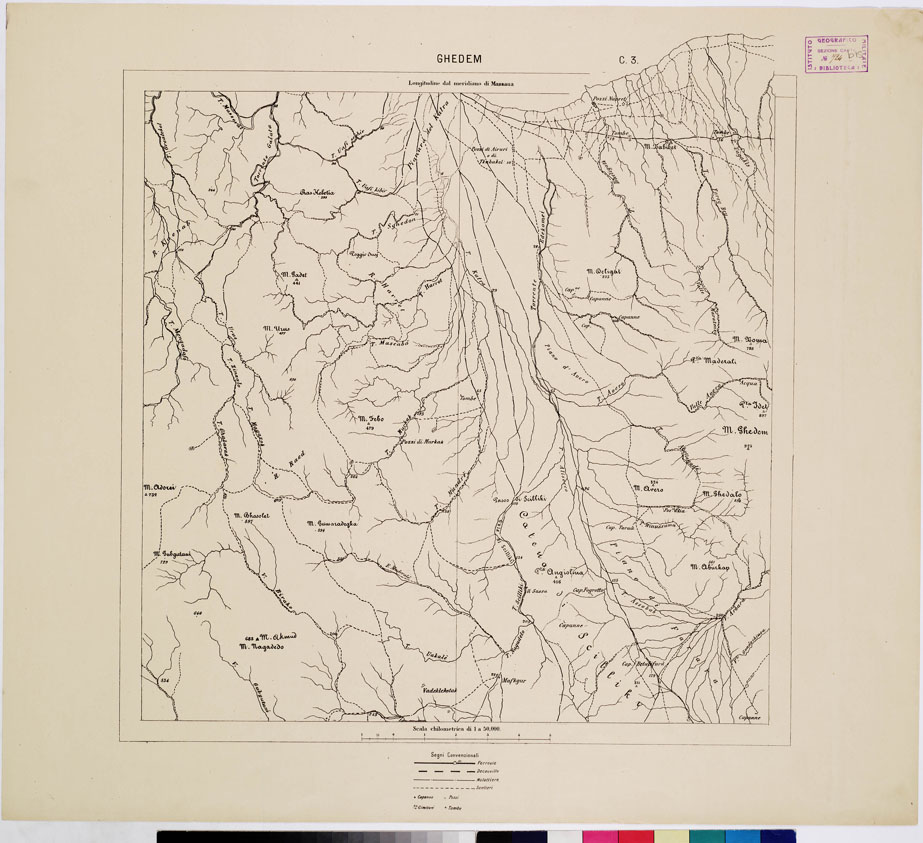 "I.G.M. Riproduzione fotozincografica delle levate originali eseguite alla medesima scala tra gli anni 1885 e 1891. Questa carta comprende la parte centrale della Colonia tra Zula, Emberèmi, Giangheren e Himberti. La proiezione adottata fu quella del Cassini con centro di sviluppo la Cupola del Palazzo del Comando a Massaua la cui posizione geografica era stata determinata astronomicamente fin dal 1885 dalla R. Marina. La carta è in 26 fogli di m. 0,40 di lato, corrispondente quindi a 20 Km. sul terreno. La pubblicazione fu iniziata nel 1890 in edizione policroma (nero per la nomenclatura, le strade, le dune di sabbia azzurro per l'drografia bistro per il terreno rosso per le quote trigonometriche) per i primi fogli e fu poi continuata in nero. In seguito la carta fu stampata interamente in nero. Nel 1909 fu allestita una nuova edizione in nero a curve di livello con equidistanza di 50 m. e numerose quote trigonometriche e topografiche. Fa eccezione il foglio Sciotel (rilevato dal Cap. Severi nel 1894) senza curve, con orografia a tratteggio. Nell'ultima edizione figurano in ciascun foglio i nomi dei mappatori e le date delle lavate."