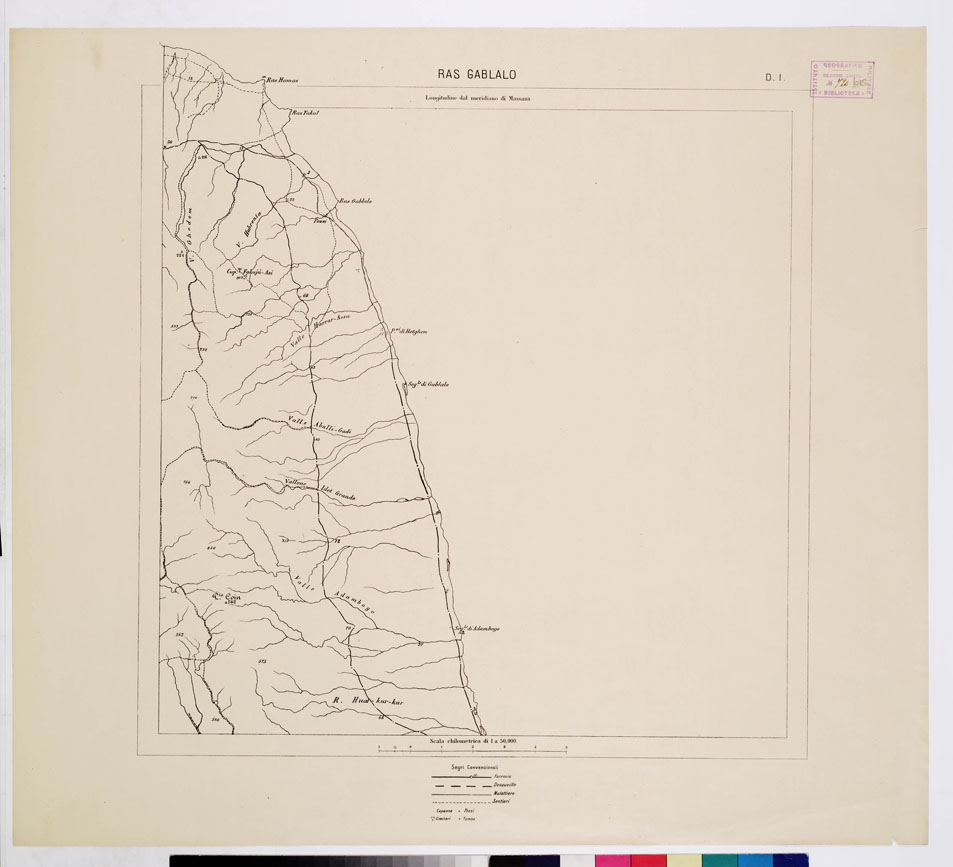 "I.G.M. Riproduzione fotozincografica delle levate originali eseguite alla medesima scala tra gli anni 1885 e 1891. Questa carta comprende la parte centrale della Colonia tra Zula, Emberèmi, Giangheren e Himberti. La proiezione adottata fu quella del Cassini con centro di sviluppo la Cupola del Palazzo del Comando a Massaua la cui posizione geografica era stata determinata astronomicamente fin dal 1885 dalla R. Marina. La carta è in 26 fogli di m. 0,40 di lato, corrispondente quindi a 20 Km. sul terreno. La pubblicazione fu iniziata nel 1890 in edizione policroma (nero per la nomenclatura, le strade, le dune di sabbia azzurro per l'idrografia bistro per il terreno rosso per le quote trigonometriche) per i primi fogli e fu poi continuata in nero. In seguito la carta fu stampata interamente in nero. Nel 1909 fu allestita una nuova edizione in nero a curve di livello con equidistanza di 50 m. e numerose quote trigonometriche e topografiche. Fa eccezione il foglio Sciotel (rilevato dal Cap. Severi nel 1894) senza curve, con orografia a tratteggio. Nell'ultima edizione figurano in ciascun foglio i nomi dei mappatori e le date delle levate."