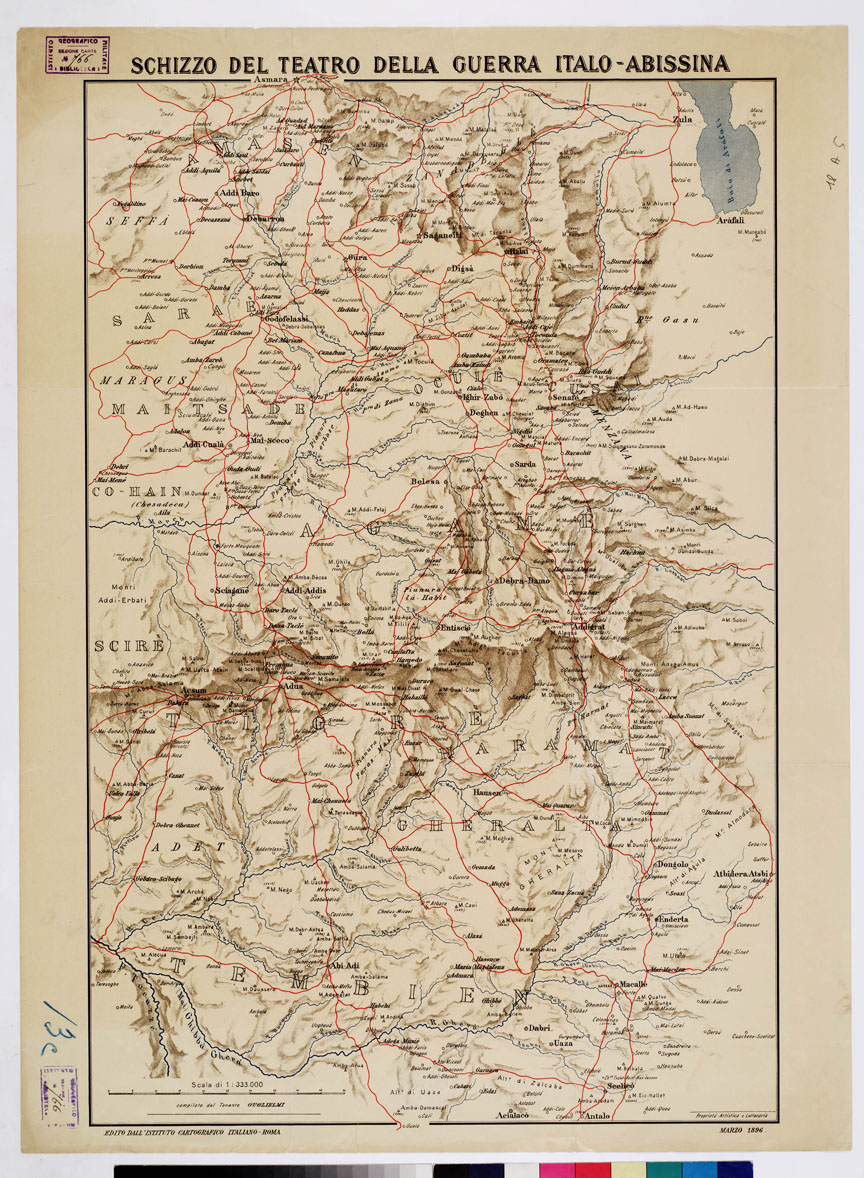 "Istituto Cartografico Italiano. Roma. Un foglio a colori compilato dal Ten. Guglielmi. Il rilievo orografico è rappresentato con lo sfumo in bistro le acque colorate in azzurro le strade in rosso. Si estende a nord a Zeila, Asmara e Abi-Adi e a sud oltre Antalo."