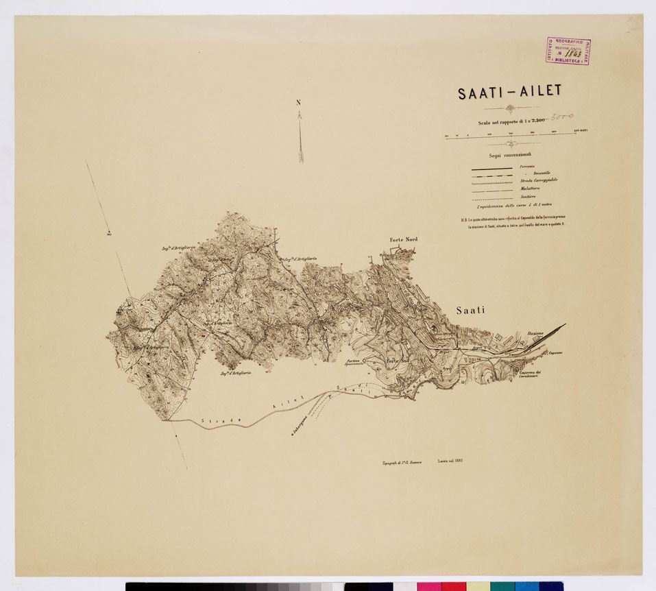 "I.G.M. Cinque tavolette rilevate dal top. Savoca nel 1890 e 1891. Esse comprendono la zona adiacente alla gola d'Ailet. Il rilievo orografico è rappresentato con curve di livello tracciate all'equidistanza di 1 m. Le quote altimetriche sono riferite al caposaldo della ferrovia presso la stazione di Saati situata a 140 m. sul livello del mare e quotato 0. Il foglio III contiene un quadro d'unione alla scala di 1:50.000. Le tavolette servirono ad un ingrandimento meccanico riprodotto in fotolito alla scala di 1:2.500 richiesto dal Comandante della Colonia Eritrea per servire allo studio della continuazione della ferrovia Ailet."