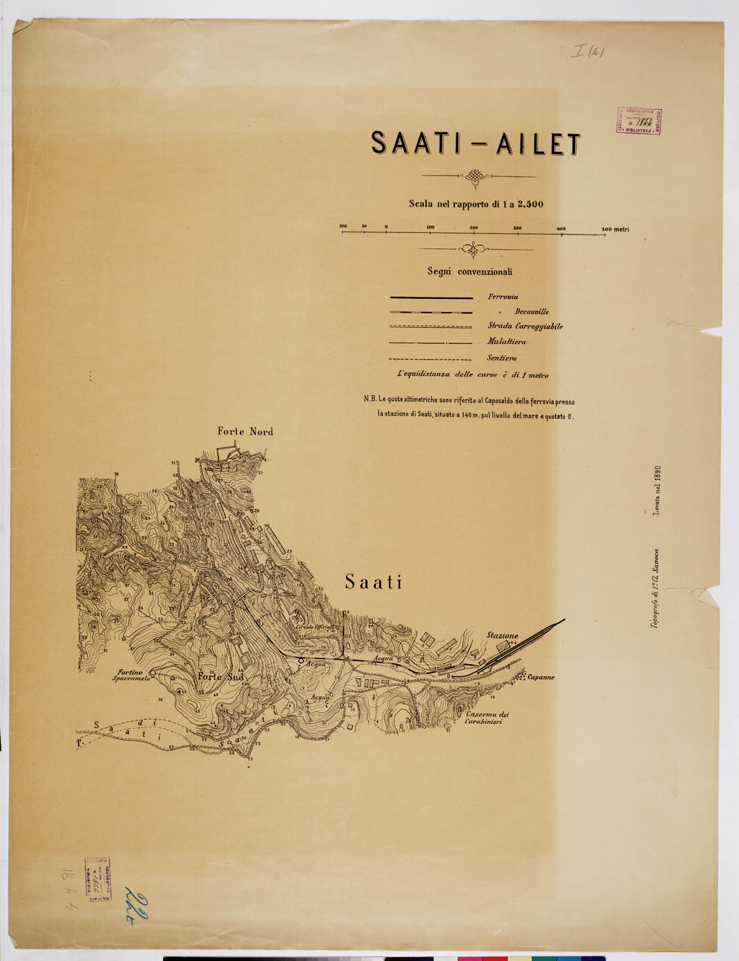 "I.G.M. Cinque tavolette rilevate dal top. Savoca nel 1890 e 1891. Esse comprendono la zona adiacente alla gola d'Ailet. Il rilievo orografico è rappresentato con curve di livello tracciate all'equidistanza di 1 m. Le quote altimetriche sono riferite al caposaldo della ferrovia presso la stazione di Saati situata a 140 m. sul livello del mare e quotato 0. Il foglio III contiene un quadro d'unione alla scala di 1:50.000. Le tavolette servirono ad un ingrandimento meccanico riprodotto in fotolito alla scala di 1:2.500 richiesto dal Comandante della Colonia Eritrea per servire allo studio della continuazione della ferrovia Ailet."