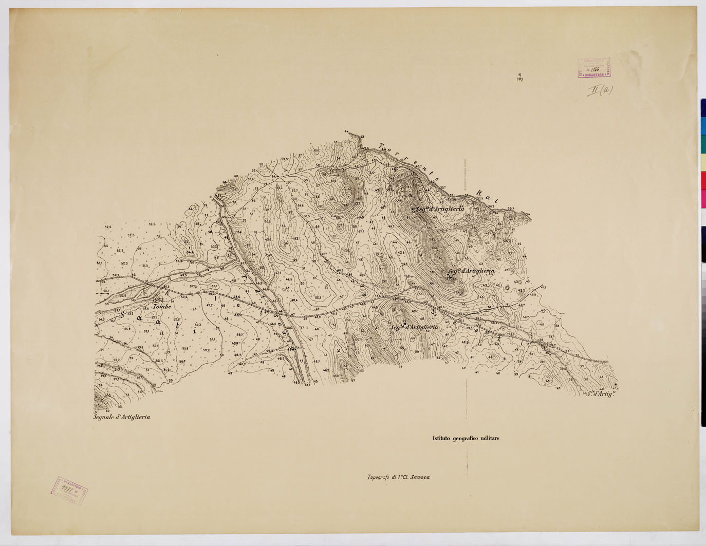 "I.G.M. Cinque tavolette rilevate dal top. Savoca nel 1890 e 1891. Esse comprendono la zona adiacente alla gola d'Ailet. Il rilievo orografico è rappresentato con curve di livello tracciate all'equidistanza di 1 m. Le quote altimetriche sono riferite al caposaldo della ferrovia presso la stazione di Saati situata a 140 m. sul livello del mare e quotato 0. Il foglio III contiene un quadro d'unione alla scala di 1:50.000. Le tavolette servirono ad un ingrandimento meccanico riprodotto in fotolito alla scala di 1:2.500 richiesto dal Comandante della Colonia Eritrea per servire allo studio della continuazione della ferrovia Ailet."