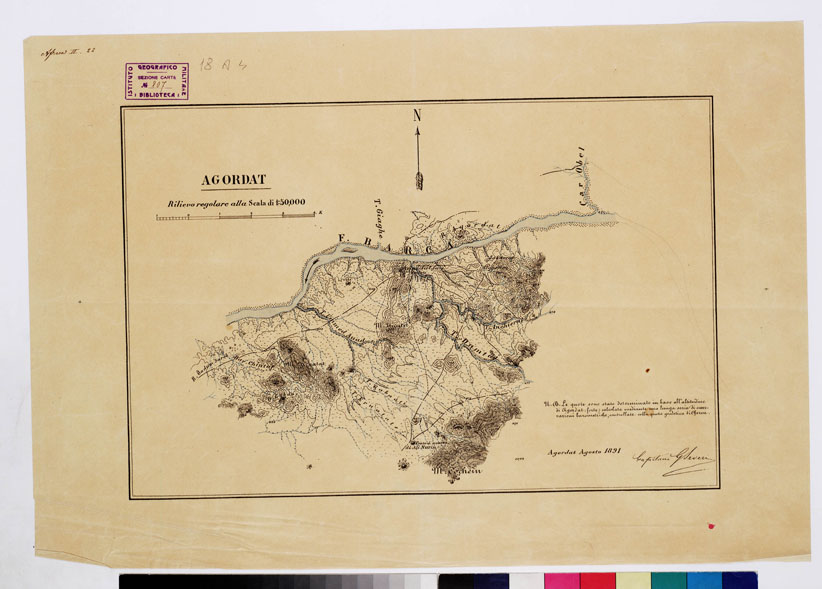 "Rilievo regolare alla scala di 1:50.000. Cap. G. Severi. Agordat. I.G.M. Riproduzione in fotozincografia in nero e azzurro. Il terreno è rappresentato con curve di livello e quote altimetriche riferite all'altitudine di Agordat (forte) calcolate mediante osservazioni barometriche controllate alla quota geometrica di Cheren."