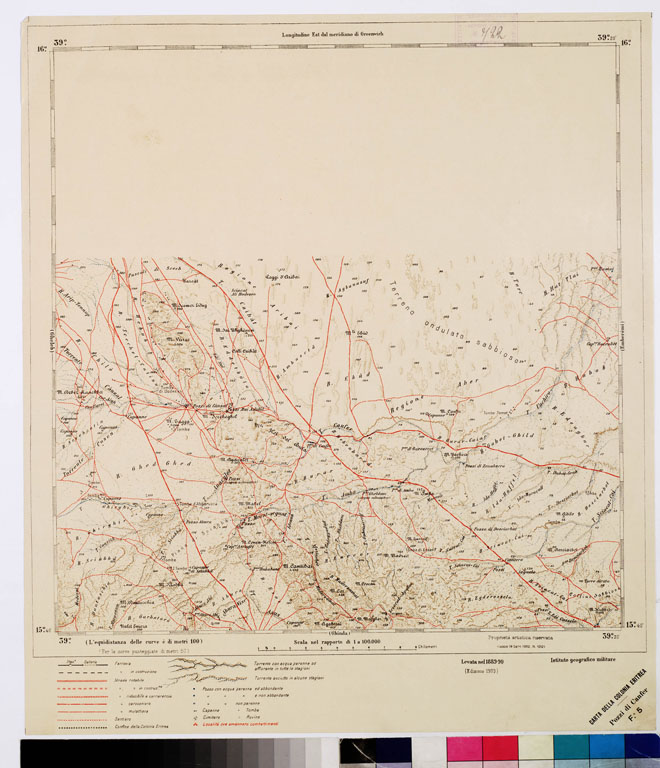 "Questa carta è fondata sulle operazioni regolari di rilevamento eseguite nel 1891 al 25.000 e riprese poi al 100.000, ritenendosi che la scala al 50.000 fosse troppo grande per il rilevamento di tutta l'Eritrea. La proiezione impiegata fu quella policentrica, non dissimile sostanzialmente da quella usata per la carta d'Italia, sostituendola a quella antecedentemente usata del Cassini. Con le nuove levate e la riduzione di quelle al 50.000 fu così allestita la carta topografica dell'Eritrea al 100.000 in 36 fogli (di cui uno per il titolo) ognuno dei quali corrisponde a un trapezio di 20' di lat. per 20' di long. Il territorio rappresentato si estende a nord al parellelo 15° 53' come nella carta al 50.000, a sud fino al confine meridionale Marèb-Belesa-Endeli, ad ovest fino a 37° 45' long. est Greenwich e a est fino al golfo di Zula e la penisola di Buri. E' stampata in cromolitografia adottando il nero per le scritture, le ferrovie, le abitazioni, i confini, l'azzurro per le acque, il bistro per le curve di livello (tracciate a linea continua di 100 in 100 metri punteggiate ogni 50 m.), rosso per la rete stradale. Per rendere più evidente la rappresentazione plastica del terreno, alle curve si aggiunse una ombreggiatura a pastello. La riproduzione fu eseguita col procedimento fotozincografico."