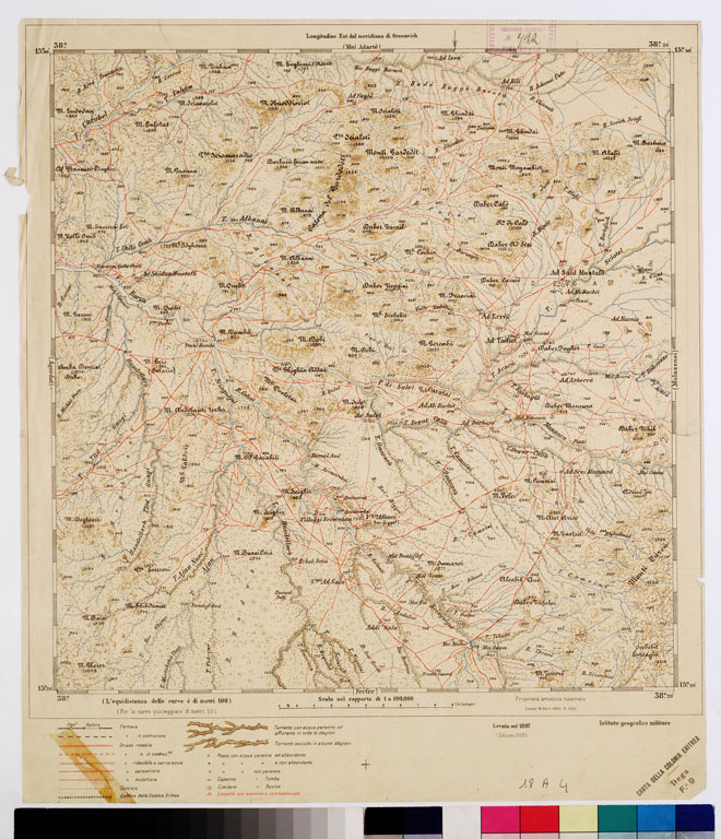 "Questa carta è fondata sulle operazioni regolari di rilevamento eseguite nel 1891 al 25.000 e riprese poi al 100.000, ritenendosi che la scala al 50.000 fosse troppo grande per il rilevamento di tutta l' Eritrea. La proiezione impiegata fu quella policentrica, non dissimile sostanzialmente da quella usata per la carta d'Italia, sostituendola a quella antecedentemente usata del Cassini. Con le nuove levate e la riduzione di quelle al 50.000 fu così allestita la carta topografica dell'Eritrea al 100.000 in 36 fogli (di cui uno per il titolo) ognuono dei quali corrisponde a un trapezio di 20' di lat. per 20' di long. il territorio rappresentato si estende a nord al parallelo 15° 53' come nella carta al 50.000 a sud fino al confine meridionale Marèb-Belesa-Endeli, ad ovest fino a 37° 45' long. est Greenwich e a est fino al golfodi Zula e la penisola di Buri. E' stampata in cromolitografia adottando il nero per le scritture, le ferrovie, le abitazioni, i confini, l'azzurro per le acque, il bistro per le curve di livello (tracciate a linea continua di 100 in 100 metri e punteggiate ogni 50 m.), rosso per la rete stradale. Per rendere più evidente la rappresentazione plastica del terreno, alle curve si aggiunge una ombreggiatura a pastello. La riproduzione fu eseguita col procedimento fotozincografico."