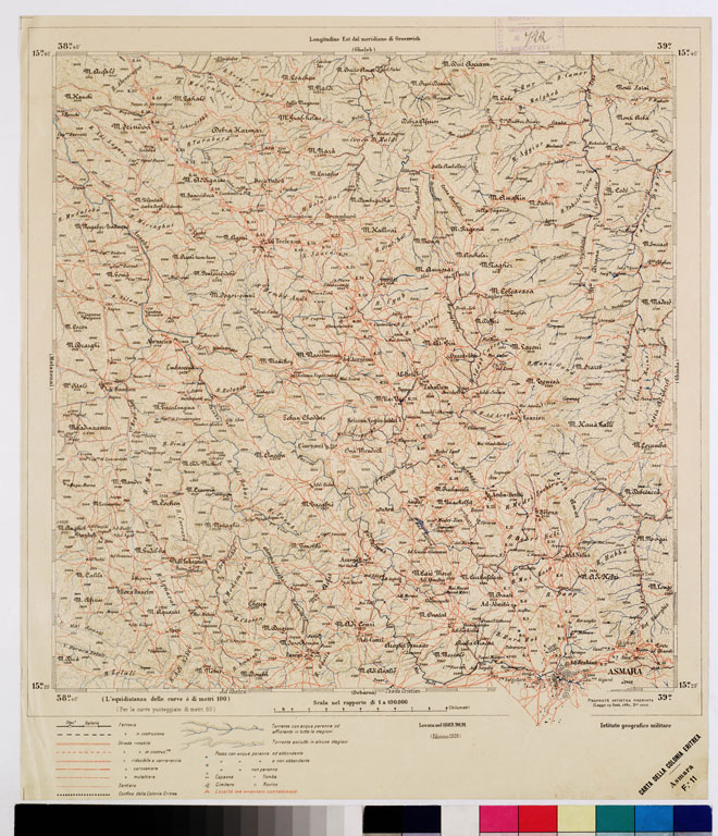 "Questa carta è fondata sulle operazioni regolari di rilevamento eseguite nel 1891 al 25.000 e riprese poi al 100.000, ritenendosi che la scala al 50.000 fosse troppo grande per il rilevamento di tutta l'Eritrea. La proiezione impiegata fu quella policentrica, non dissimile sostanzialmente da quella usata per la carta d'Italia, sostituendola a quella antecedentemente usata del Cassini. Con le nuove levate e la riduzione di quelle al 50.000 fu così allestita la carta topografica dell'Eritrea al 100.000 in 36 fogli (di cui uno per il titolo) ognuno dei quali corrisponde a un trapezio di 20' di lat. per 20' di long. Il territorio rappresentato si estende a nord al parallelo 15° 53' come nella carta al 50.000, a sud fino al confine meridionale Marèb-Belesa-Endeli, ad ovest fino a 37° 45' long. est Greenwich e a est fino al golfo di Zula e la penisola di Buri. E' stampata in cromolitografia adottando il nero per le scritture, le ferrovie, le abitazioni, i confini, l'azzurro per le acque, il bistro per le curve di livello (tracciate a linea continua di 100 in 100 metri e punteggiate ogni 50 m.), rosso per la rete stradale. Per rendere più evidente la rappresentazione plastica del terreno, alle curve si aggiunge una ombreggiatura a pastello. La riproduzione fu eseguita col procedimento fotozincografico."