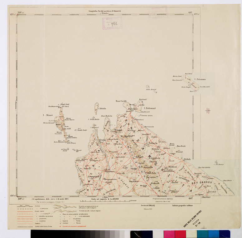 "Questa carta è fondata sulle operazioni regolari di rilevamento eseguite nel 1891 al 25.000 e riprese poi al 100.000, ritenendosi che la scala al 50.000 fosse troppo grande per il rilevamento di tutta l'Eritrea. La proiezione impiegata fu quella policentrica, non dissimile sostanzialmente da quella usata per la carta d'Italia, sostituendola a quella antecedentemente usata del Cassini. Con le nuove levate e la riduzione di quelle al 50.000 fu così allestita la carta topografica dell'Eritrea al 100.000 in 36 fogli (di cui uno per il titolo) ognuno dei quali corrisponde a un trapezio di 20' di lat. per 20' di long. Il territorio rappresentato si estende a nord al parallelo 15° 53' come nella carta al 50.000, a sud fino al confine meridionale Marèb-Belesa-Endeli, ad ovest fino a 37° 45' long. est Greenwich e a est fino al golfo di Zula e la penisola di Buri. E' stampata in cromolitografia adottando il nero per le scritture, le ferrovie, le abitazioni, i confini, l'azzurro per le acque, il bistro per le curve di livello (tracciate a linea continua di 100 in 100 metri e punteggiate ogni 50 m.), rosso per la rete stradale. Per rendere più evidente la rappresentazione plastica del terreno, alle curve si aggiunge una ombreggiatura a pastello. La riproduzione fu eseguita col procedimento fotozincografico."