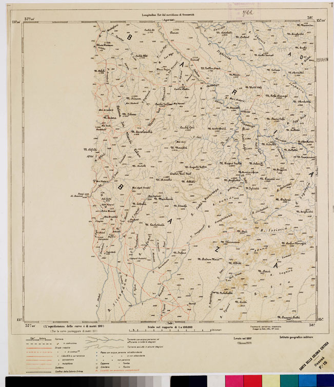 "Questa carta è fondata sulle operazioni regolari di rilevamento eseguite nel 1891 al 25.000 e riprese poi al 100.000, ritenendosi che la scala al 50.000 fosse troppo grande per il rilevamento di tutta l'Eritrea. La proiezione impiegata fu quella policentrica, non dissimile sostanzialmente da quella usata per la carta d'Italia, sostituendola a quella antecedentemente usata del Cassini. Con nuove levate e la riduzione di quelle al 50.000 fu così allestita la carta topografica dell'Eritrea al 100.000 in 36 fogli (di cui uno per il titolo) ognuno dei quali corrisponde a un trapezio di 20' di lat. per 20' di long. Il territorio rappresentato si estende a nord al parallelo 15° 53' come nella carta al 50.000 a sud al confine meridionale Marèb-Belesa-Endeli, ad ovest fino a 37° 45' long. est Greenwich e a est fino al golfo di Zula e la penisola di Buri. E' stampata in cromolitografia adottando il nero per le scritture, le ferrovie, le abitazioni, i confini, l'azzurro per le acque, il bistro per le curve di livello (tracciate a linea continua di 100 in 100 metri e punteggiate ogni 50 m.), rosso per la rete stradale. Per rendere più evidente la rappresentazione plastica del terreno, alle curve si aggiunse una ombreggiatura a pastello. La riproduzione fu eseguita col procedimento fotozincografico."
