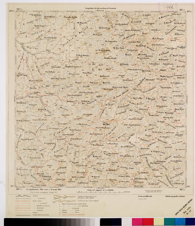 "Questa carta è fondata sulle operazioni regolari di rilevamento eseguite nel 1891 al 25.000 e riprese poi al 100.000, ritenendosi che la scala al 50.000 fosse troppo grande per il rilevamento di tutta l'Eritrea. La proiezione impiegata fu quella policentrica, non dissimile sostanzialmente da quella usata per la carta d' Italia, sostituendola a quella antecedentemente usata del Cassini. Con le nuove levate e la riduzione di quelle al 50.000 fu così allestita la carta topografica dell'Eritrea al 100.000 in 36 fogli (di cui uno per il titolo) ognuno dei quali corrisponde a un trapezio di 20' di lat. per 20' di long. Il territorio rappresentato si estende a nord al parallelo 15° 53' come nella carta al 50.000, a sud fino al confine meridionale Marèb-Belesa-Endeli, ad ovest fino a 37° 45 long. est Greenwich e a est fino al golfo di Zula e la penisola di Buri. E' stampata in cromolitografia adottando il nero per le scritture, le ferrovie, le abitazioni, i confini, l'azzurro per le acque, il bistro per le curve di livello (tracciate a linea continua di 100 in 100 metri punteggiate ogni 50 m.), rosso per la rete stradale. Per rendere più evidente la rappresentazione plastica del terreno, alle curve si aggiunge una ombreggiatura a pastello. La riproduzione fu eseguita col procedimento fotozincografico."