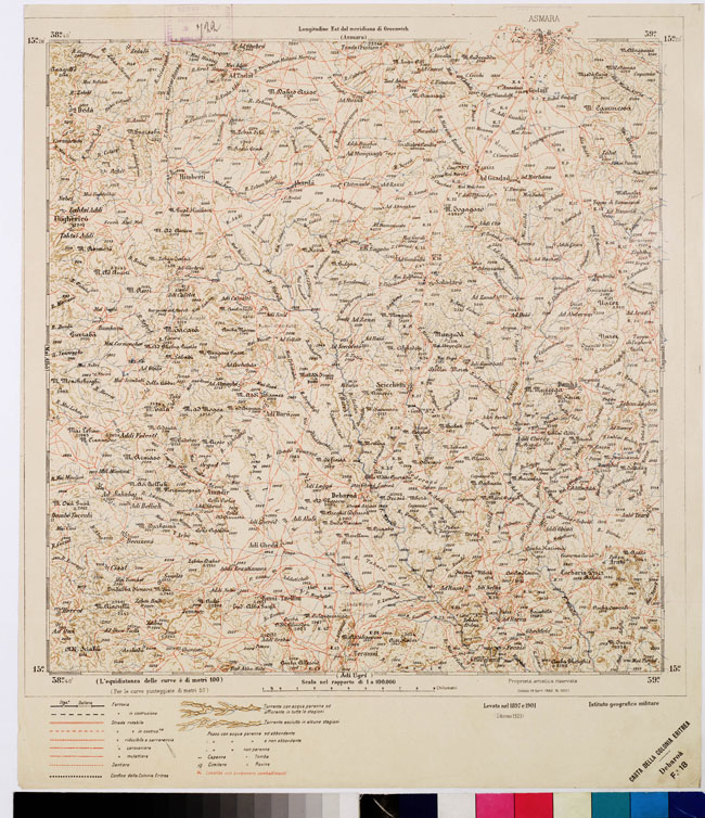 "Questa carta è fondata sulle operazioni regolari di rilevamento eseguite nel 1891 al 25.000 e riprese poi al 100.000, ritenendosi che la scala al 50.000 fosse troppo grande per il rilevamento di tutta l'Eritrea. La proiezione impiegata fu quella policentrica, non dissimile sostanzialmente da quella usata per la carta d'Italia, sostituendola a quella antecedentemente usata del Cassini. Con le nuove levate e la riduzione di quelle al 50.000 fu così allestita la carta topografica dell'Eritrea al 100.000 in 36 fogli (di cui uno per il titolo) ognuno dei quali corrisponde a un trapezio di 20' di lat. per 20' long. IL territorio rappresentato si estende a nord al parallelo 15° 53' come nella carta al 50.000, a sud fino al confine meridionale Marèb-Belesa-Endeli, ad ovest fino a 37° 45 long. est Greenwich e a est fino al golfo di Zula e la penisola di Buri. E' stampata in cromolitografia adottando il nero per le scritture, le ferrovie, le abitazioni, i confini, l'azzurro per le acque, il bistro per le curve di livello (tracciate a linea continua di 100 in 100 metri e punteggiate ogni 50 m.), rosso per la rete stradale. Per rendere più evidente la rappresentazione plastica del terreno, alle curve si aggiunge una ombreggiatura a pastello. La riproduzione fu eseguita col procedimento fotozincografico."