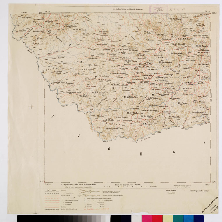 "Questa carta è fondata sulle operazioni regolari di rilevamento eseguite nel 1891 al 25.000 e riprese poi al 100.000, ritenendosi che la scala al 50.000 fosse troppo grande per il rilevamento di tutta l'Eritrea. La proiezione impiegata fu quella policentrica, non dissimile sostanzialmente da quella usata per la carta d'Italia, sostituendola a quella antecedentemente usata del Cassini. Con le nuove levate e la riduzione di quelle al 50.000 fu così allestita la carta topografica dell'Eritra al 100.000 in 36 fogli (di cui uno per titolo) ognuno dei quali corrisponde a un trapezio di 20' di lat. per 20' di long. Il territorio rappresentato si estende a nord al parallelo 15° 53' come nella carta al 50.000 a sud fino al confine meridionale Marèb-Belesa-Endeli, ad ovest fino a 37° 45' long. e a est fino al golfo di Zula e la penisola di Buri. E' stampata in cromolitografia adottando il nero per le scritture, le ferrovie, le abitazioni, i confini, l'azzurro per le acque, il bistro per le curve di livello (tracciate a linea continua di 100 in 100 metri e punteggiate ogni 50 m.), rosso per la rete stradale. Per rendere più evidente la rappresentazione plastica del terreno, alle curve si aggiunge una ombreggiatura a pastello. La riproduzione fu eseguita col procedimento fotozincografico."