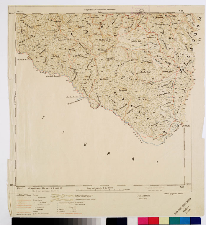 "Questa carta è fondata sulle operazioni regolari di rilevamento eseguite nel 1891 al 25.000 e riprese poi al 100.000, ritenendosi che la scala al 50.000 fosse troppo grande per il rilevamento di tutta l'Eritrea. La proiezione impiegata fu quella policentrica, non dissimile sostanzialmente da quella usata per la carta d'Italia, sostituendola a quella antecedentemente usata del Cassini. Con le nuove levate e la riduzione di quelle al 50.000 fu così allestita la carta topografica dell'Eritrea al 100.000 in 36 fogli (di cui uno per il titolo) ognuno dei quali corrisponde a un trapezio di 20' di lat. per 20' di long. Il territorio rappresentato si estende a nord al parallelo 15° 53' come nella carta al 50.000, a sud fino al confine meridionale Marèb-Belesa-Endeli, ad ovest fino a 37° 45' long. est Greenwich e a est fino al golfo di Zula e la penisola di Buri. E' stampata in cromolitografia adottando il nero per le scritture, le ferrovie, le abitazioni, i confini, l'azzurro per le acque, il bistro per le curve di livello (tracciate a linea continua di 100 in 100 metri e punteggiate ogni 50 m.), rosso per la rete stradale. Per rendere più evidente la rappresentazione pliastica del terreno, alle curve si aggiunge una ombreggiatura a pastello. La riproduzione fu eseguita col procedimento fotozincografico."