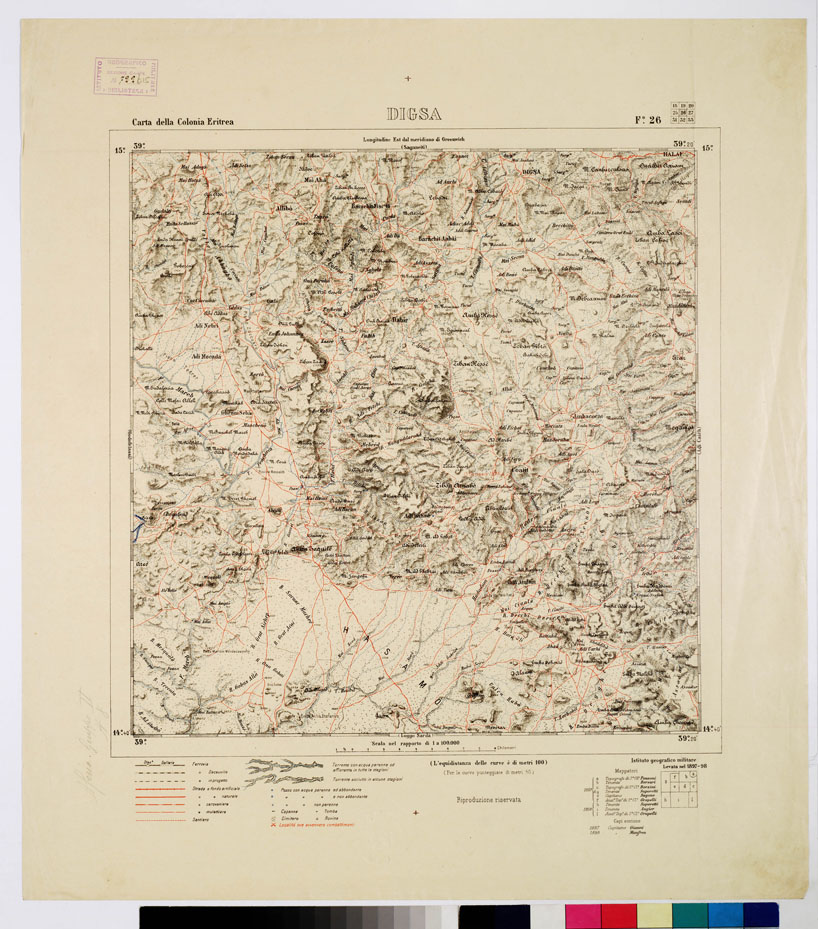 "Questa carta è fondata sulle operazioni regolari di rilevamento eseguite nel 1891 al 25.000 e riprese poi al 100.000, ritenendosi che la scala al 50.000 fosse troppo grande per il rilevamento di tutta l'Eritrea. La proiezione impiegata fu quella policentrica, non dissimile sostanzialmente da quella usata per la carta d'Italia, sostituendola a quella antecedentemente usata del Cassini. Con le nuove levate e la riduzione di quelle al 50.000 fu così allestita la carta topografica dell'Eritrea al 100.000 in 36 fogli (di cui uno per il titolo) ognuno dei quali corrisponde a un trapezio di 20' di lat. per 20' di long. Il territorio rappresentato si estende a nord al parallelo 15° 53' come nella carta al 50.000, a sud fino al confine meridionale Marèb-Belesa-Endeli, ad ovest fino a 37° 45' long. est Greenwich e a est fino al golfo di Zula e la penisola di Buri. E' stampata in cromolitografia adottando il nero per le scritture, le ferrovie, le abitazioni, i confini. l'azzurro per le acque, il bistro per le curve di livello (traccaite a linea continua di 100 in 100 metri punteggiate ogni 50 m.), rosso per la rete stradale. Per rendere più evidente la rappresentazione plastica del terreno, alle curve si aggiunse una ombreggiatura a pastello. La riproduzione fu eseguita col procedimento fotozincografico."