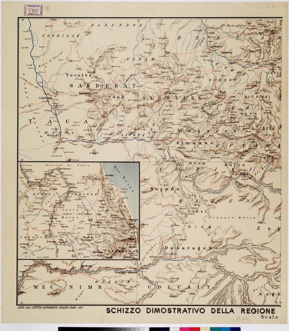 "Istituto Cartografico Italiano, Roma. Due fogli riprodotti in zincografia con cartina sussidiaria per la Nubia Superiore. Stampa policroma con orografia a sfumo, rete fluviale in azzurro, strade in rosso, scritture in nero. Sono indicate varie quote altimetriche. "