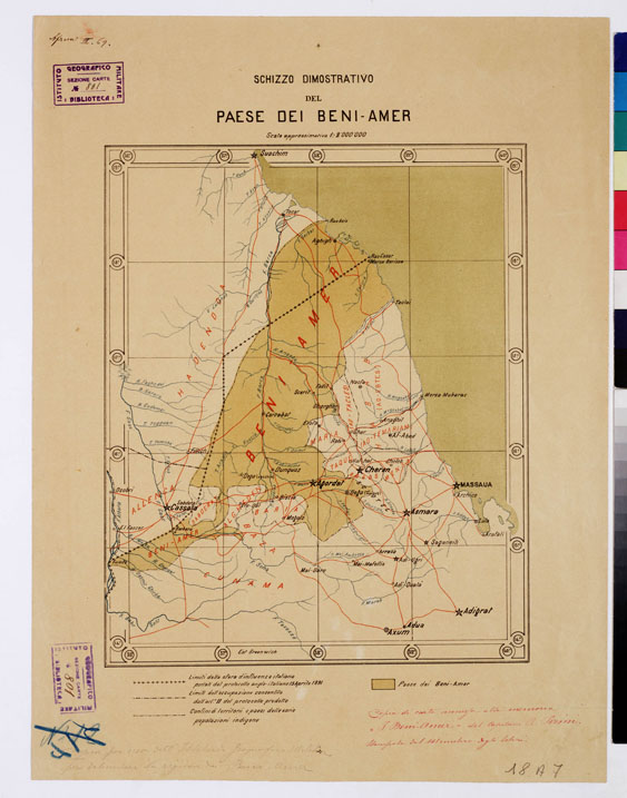 "Copia di carta annessa alla memoria "I Beni Amer", del Cap. R. Perini (1905), stampata dal Ministero degli Esteri. Stampa a colori con i limiti della sfera di influenza italiana portati dal protocollo anglo-italiano del 15 aprile 1891, i limiti dell'occupazione consentita all'articolo 11 del protocollo predetto e i confini dei territori e paesi delle varie popolazioni indigene. É rappresentata la sola planimetria. Le longitudini derivano dal meridiano di Greenwich."