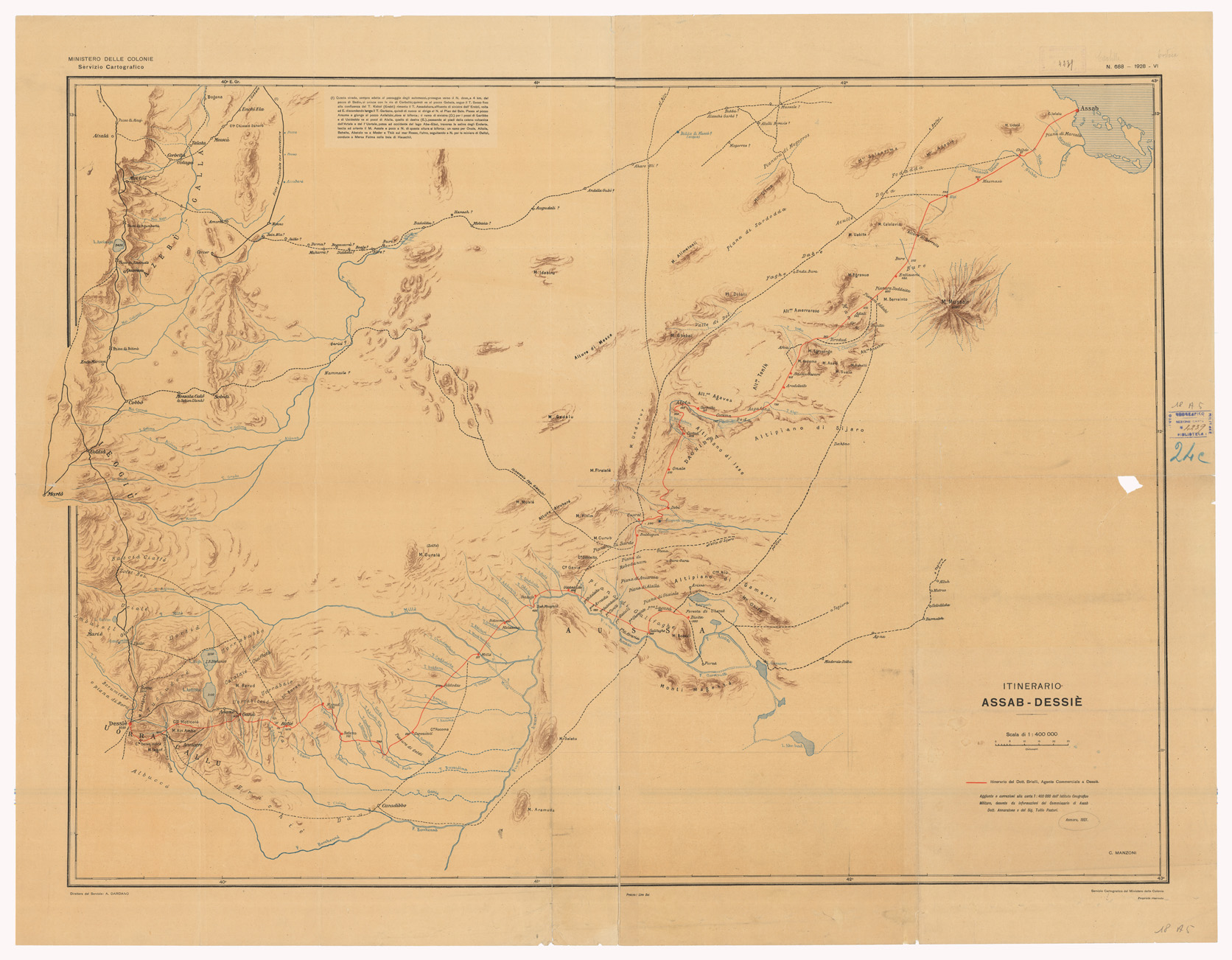 "Servizio Cartografico del Ministero delle Colonie. Un foglio a colori con tracciato l'itinerario del dott. Brielli, Agente Commerciale a Dessié e aggiunte e correzioni alla carta al 400.000 dell'I.G.M. desunte da informazioni del Commissario di Assab dott. Amaratone e da T. Pastori. Vi è inserita una breve notizia illustrativa della strada."