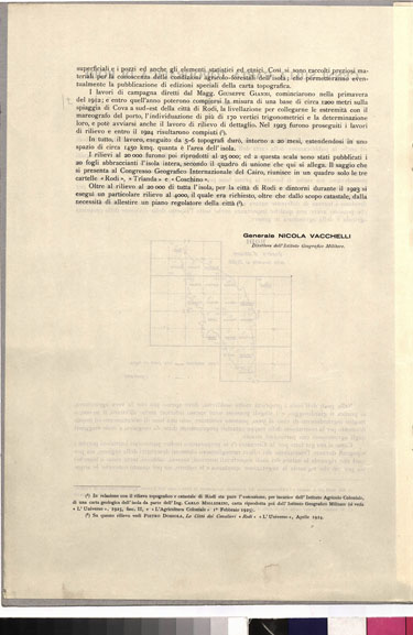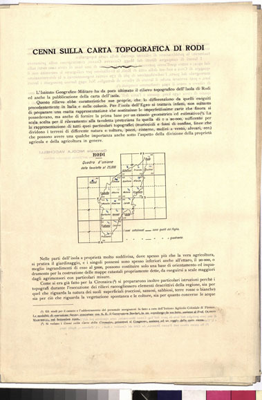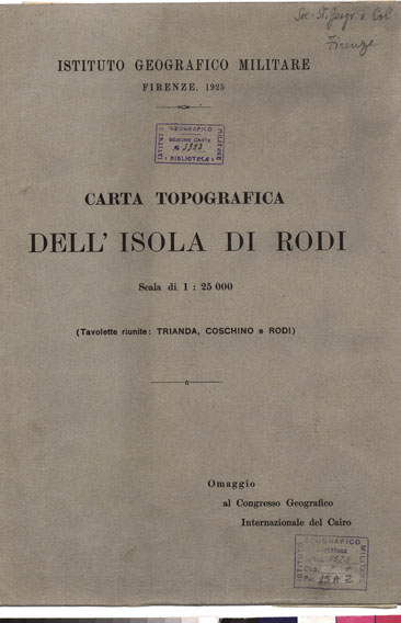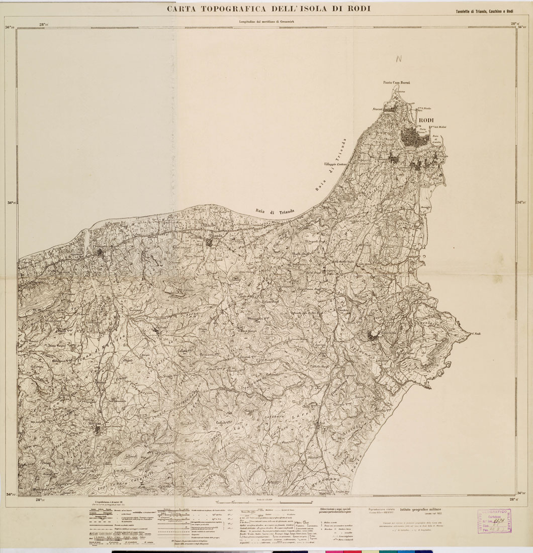 "Un foglio che riunisce le tavolette di Trianda, Coschino e Rodi, presentato in omaggio al Congresso Geografico Internazionale del Cairo. Stampa in nero. Orografia a curve di livello tracciate alla equidistanza di 10 metri con curve punteggiate ogni 5 metri. Annessi alcuni "Cenni sulla carta topografica di Rodi". La carta riporta la data 1922, il documento 1925."