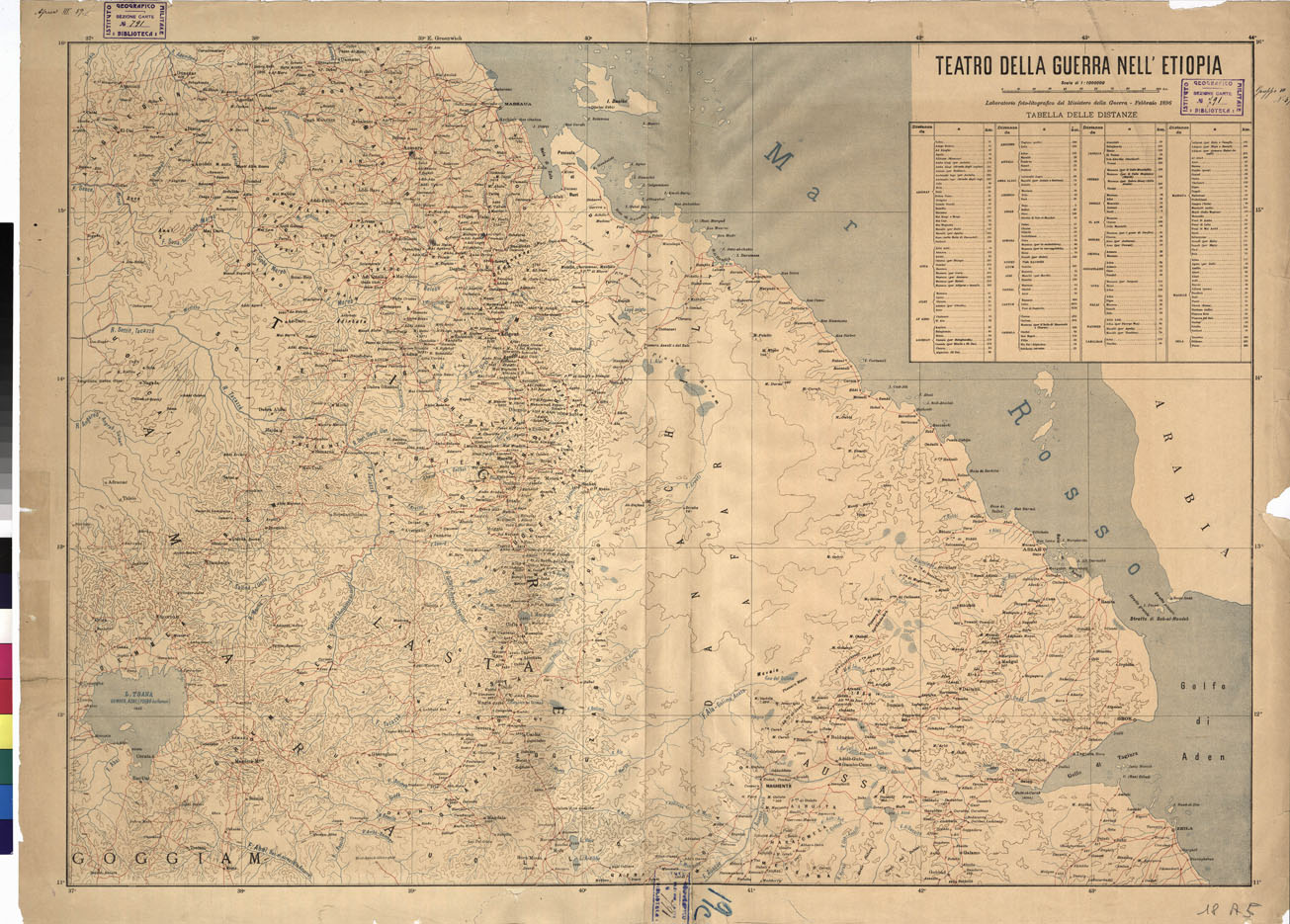 "Laboratorio Foto-Litografico del Ministero della Guerra. Febbraio 1896 Un foglio a colori con orografia rappresentata dimostrativamente a curve di livello in bistro, acque in azzurro, rete stradale in rosso. Si estende al territorio compreso fra 37° e 44° di long. est Greenwich e tra 11° e 16° lat. nord. Vi è inserita una tabella delle distanze in Km. tra le varie località segnate sulla carta."