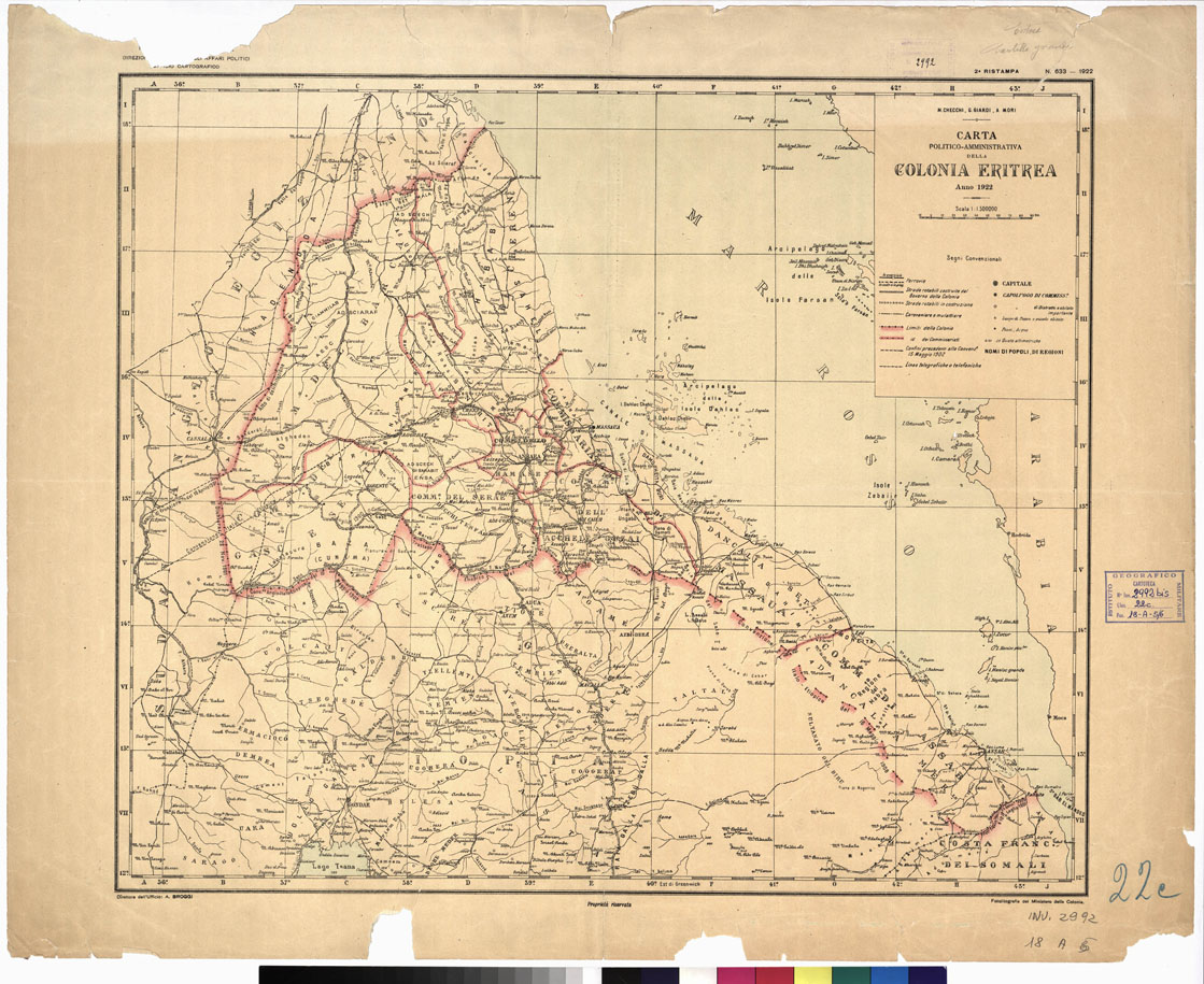 "Ministero delle Colonie. Direzione Generale degli Affari Politici. Ufficio Cartografico. Schizzo generale con la sola planimetria stampato a colori. Vi sono segnati i confini di Colonia e di Commissariato, le ferrovie, le strade e carovaniere le linee telegrafiche e telefoniche, nomi di popoli e di regioni, ecc. Le longitudini si riferiscono al meridiano di Greenwich. Compilazione di M. Checchi, G. Giardi, A. Mori. "