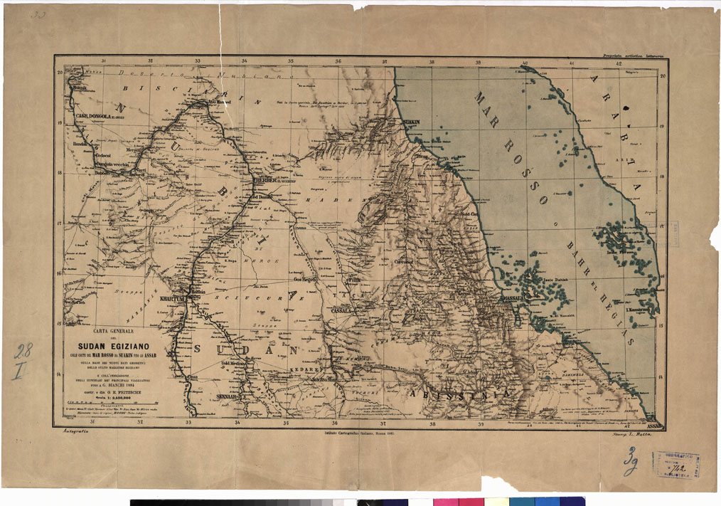 CARTA GENERALE DEL SUDAN EGIZIANO COLLE COSTE DEL MAR ROSSO DA SUAKIN FINO AD ASSAB SULLA BASE DEI NUOVI DATI GEODETICI DELLO STATO MAGGIORE EGIZIANO E COLL'INDICAZIONE DEGLI ITINERARI DEI PRINCIPALI VIAGGIATORI FINO A G. BIANCHI 1884.