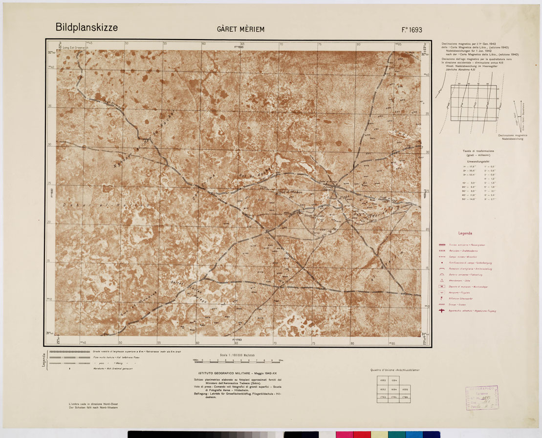 "I.G.M. Carta magnetica della Libia. Schizzo planimetrico elaborato su fotopiani approssimati forniti dal Ministero dell'aereonautica tedesca (Sobia). Volo di presa: Comando voli fotografici di grandi superfici Scuola di fotografia aerea - Hildesheim. In questo foglio è tracciata la quadrettatura dell'armata tedesca. In basso alla carta la legenda dei segni e quadro d'unione."