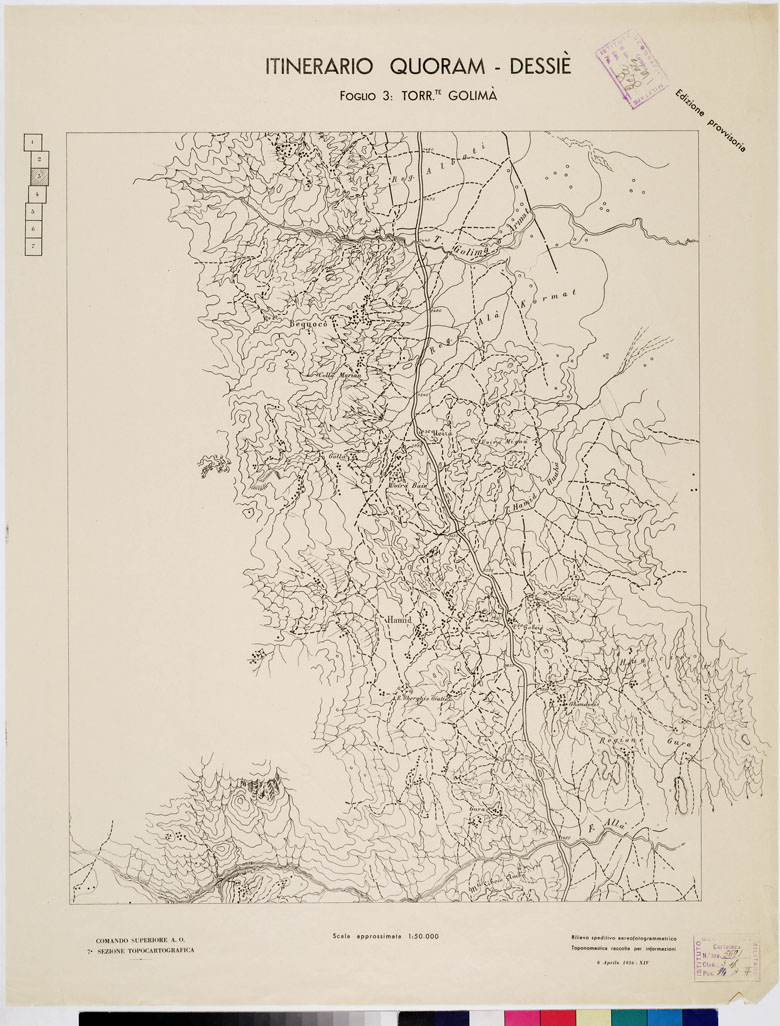 "COMANDO SUPERIORE A.O. 7^ SEZIONE TOPOCARTOGRAFICA. Rilievo speditivo aereofotogrammetrico. Toponomastica raccolta per informazioni."