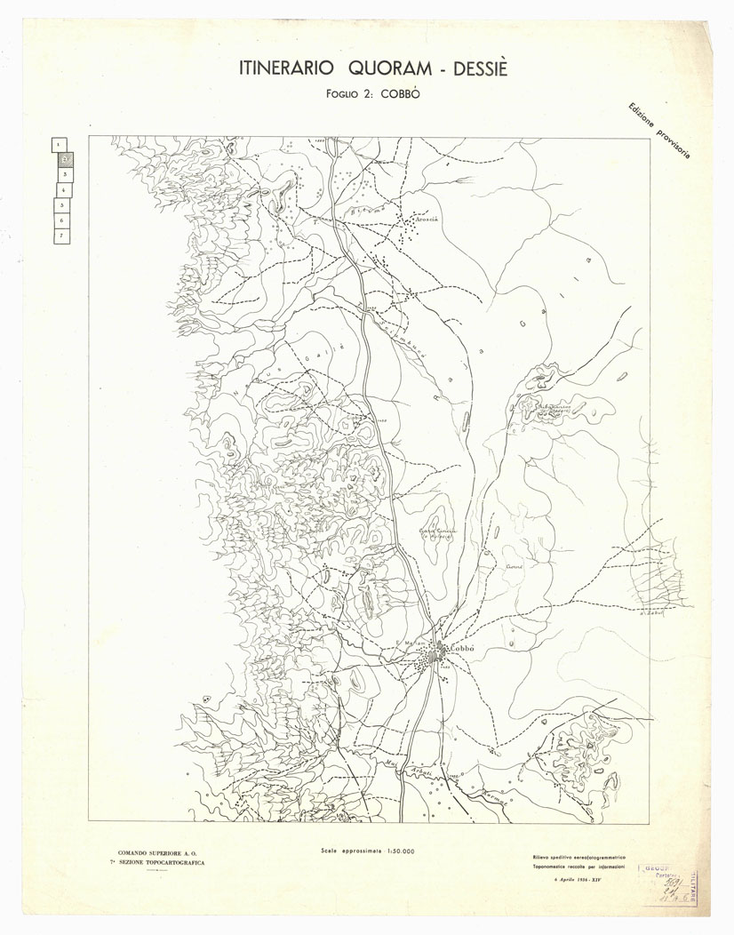 "COMANDO SUPERIORE A.O. 7^ SEZIONE TOPOCARTOGRAFICA. Rilievo speditivo aereofotogrammetrico. Toponomastica raccolta per informazioni."